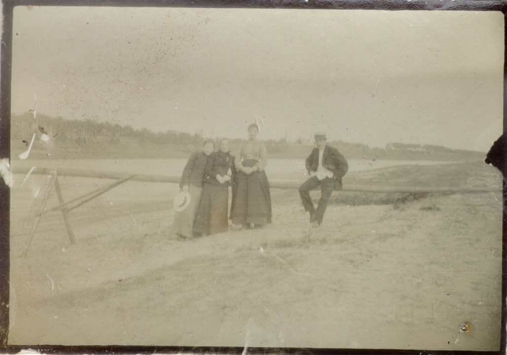 Наталия Павловна Дурдина с матерью и неизвестными женщинами у лестницы перед домом