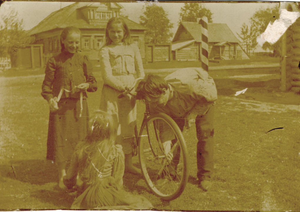 Дети у велосипеда на деревенской улице