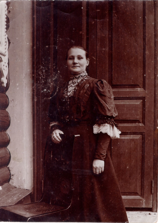 Наталия Павловна Дурдина с матерью и неизвестными женщинами у лестницы перед домом