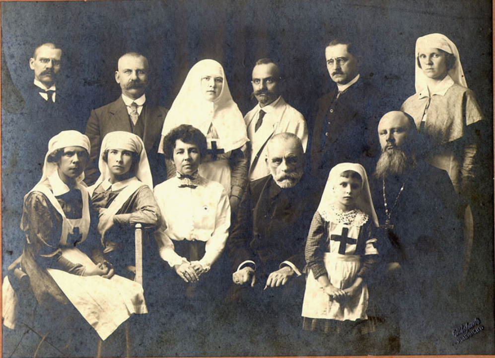 Наталия Павловна Дурдина с матерью и неизвестными женщинами у лестницы перед домом