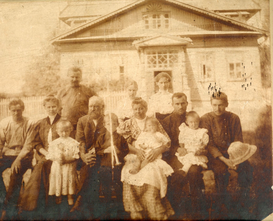 Наталия Павловна Дурдина с матерью и неизвестными женщинами у лестницы перед домом