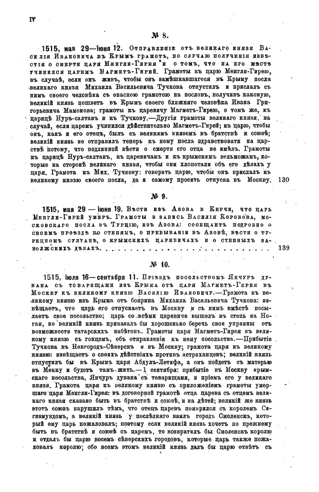 Настоящий том является продолжение издания «Памятников дипломатических сношений Московского государства с державами иностранными» и заключает в себе дипломатические сношения древней России с Ногайской и Крымской ордами и с Турцией, за время правления великого князя Василия III. Главная цель сношений с ордами со стороны великого князя состояла в том, чтобы добиться заключения союза против Литовского великого князя, а со стороны крымского царя — чтобы добиться освобождения из Московского плена Крымского царевича Абдыл-Летифа и получит помощь против Астраханского царства. Сношения же с Турцией ограничивались в основном торговыми целями. Материалом для этого тома послужили статейные списки, хранящиеся в Московском архиве министерства иностранных дел.