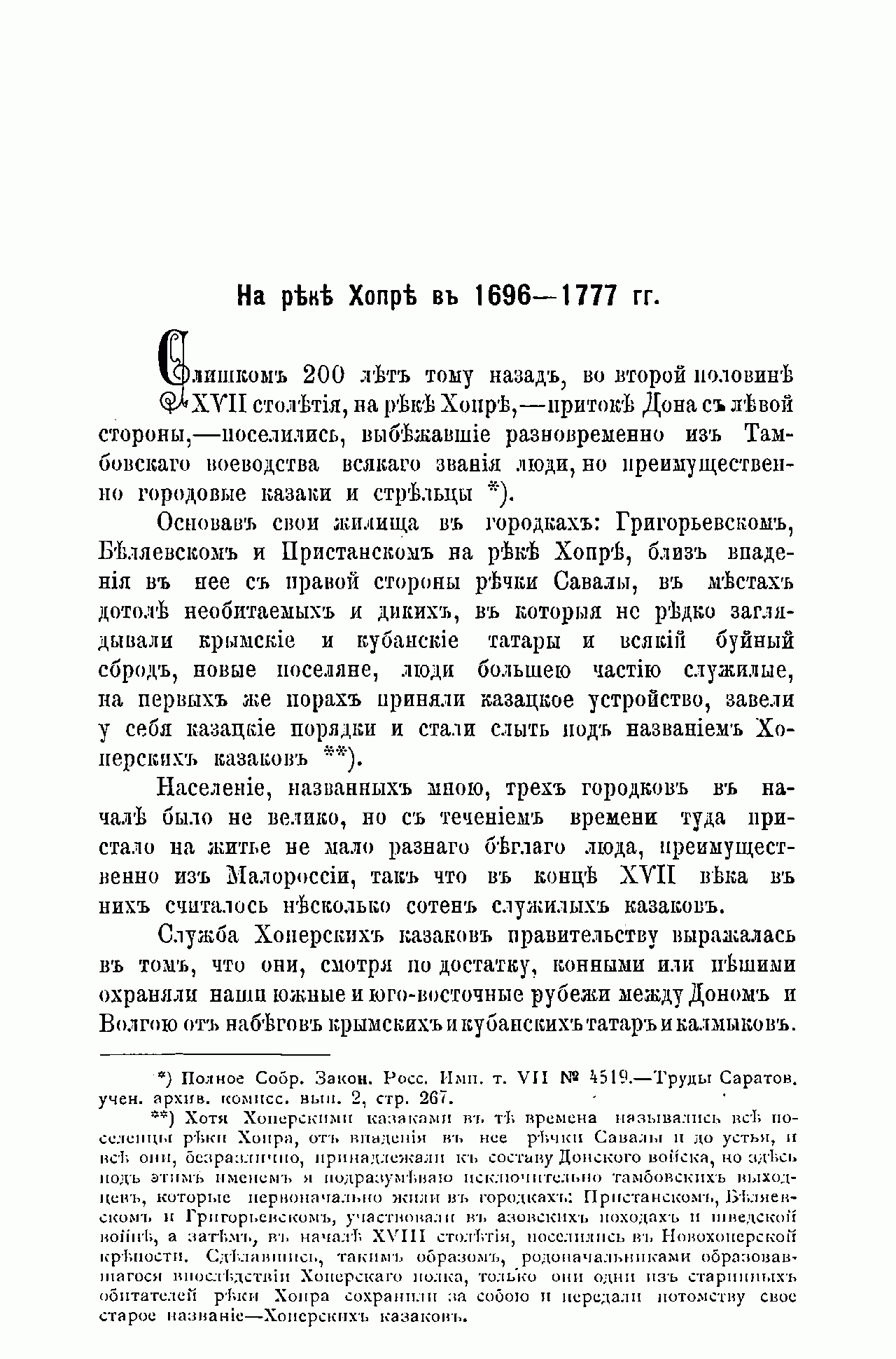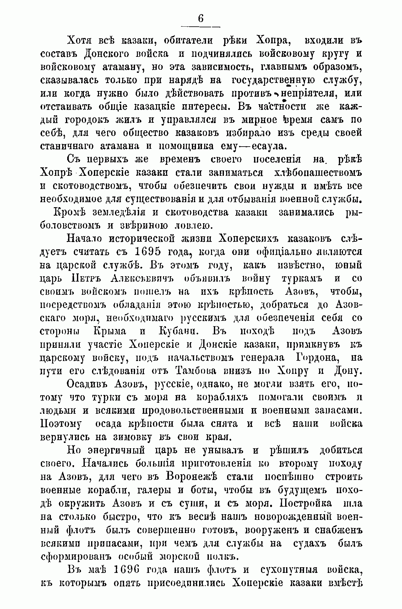 Документальное описание боевых действий полка и знаменательных исторических событий, связанных с ним, за период 1696 – 1896 годов. Приведен список высочайших наград, жалованных Хоперскому полку за подвиги и отличную службу.
