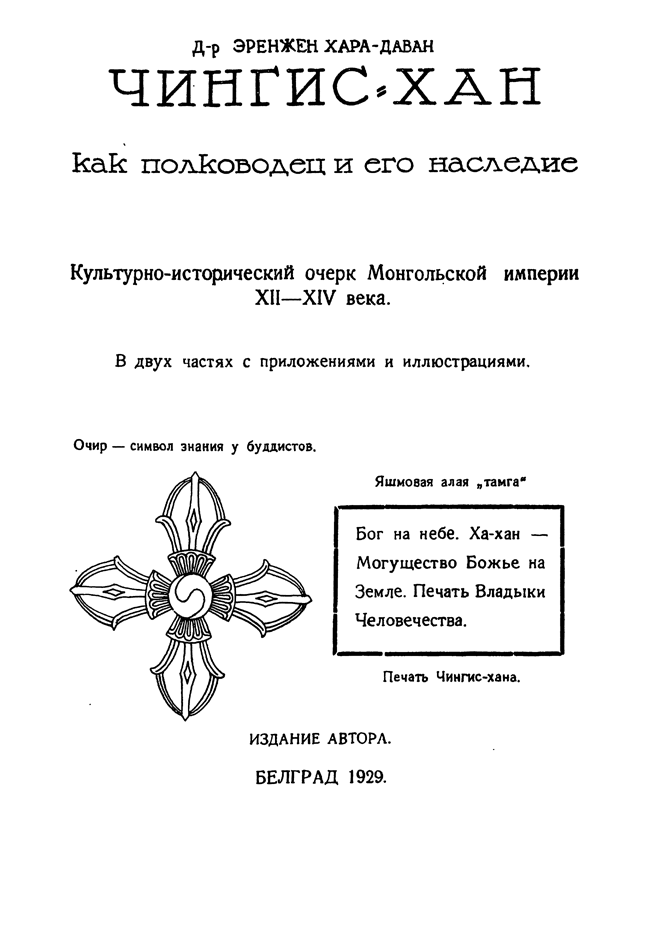 Доктор Э. Хара-Даван издал книгу «Чингис-Хан как поководец и его наследие» в 1929 году на собственные средства. Автор выражает свою точку зрения на личность и завоевания великого полководца. Идеалом Чингис-хана было «создание единого царства Человечества», при котором «прекратятся взаимные войны и создадутся условия для мирного процветания человечества как в области духовной, так и материальной культуры». Автор делает выводы о влиянии «монгольского ига» на государственность России.