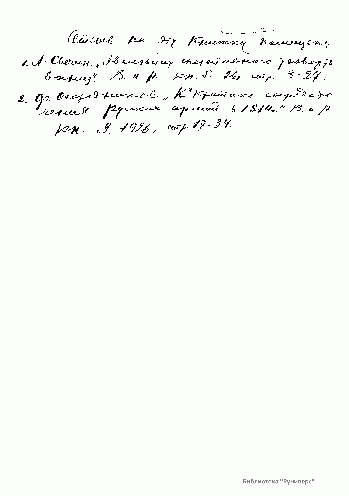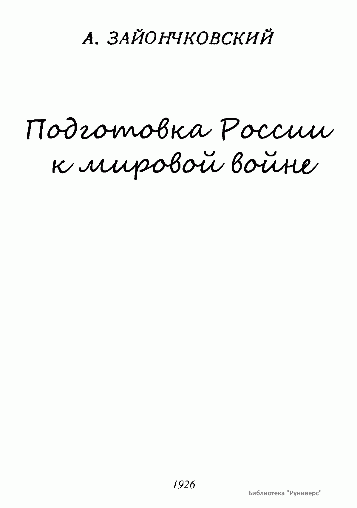 Наиболее известное капитальное военно-историческое исследование о подготовке вооруженных сил Российской империи к началу мировой войны с широким историко-стратегическим ретроспективным анализом мобилизационных возможностей России, геополитическим обозрением театров военных действий на стратегических направлениях. Данный труд, а также ряд других изданий по данной проблематике, был подготовлен выдающимся отечественным военным историком генералом от инфантерии русской армии А.М. Зайончковским, который в 1918 г., наряду с другими видными военными деятелями поступил на службу в РККА. С мая 1920 г. Зайончковский являлся членом Особого совещания при Главнокомандующем всеми Вооруженными Силами Республики, был помощником председателя Военно-исторической комиссии по описанию Первой мировой войны при военно-исторической части (позднее в составе военно-исторического отдела) Всероссийского главного штаба РККА и руководителем работ по исследованию опыта мировой войны. Всего же этой комиссией было подготовлено 39 работ о Первой мировой войне. На их основе был также издан «Стратегический очерк войны 1914-1918» (т. 1-7, 1920-23). В этих трудах приводятся многочисленных оперативные документы, и даётся фактологическое описание войны на русском фронте. А.М. Зайончковский внёс большой вклад в исследование проблем стратегического планирования, развертывания и стратегического руководства российской армии в годы Первой мировой войны, в популяризацию военно-научных работ русских и западноевропейских классиков по истории военного искусства. В дальнейшем вплоть до своей кончины в 1926 г. он служил профессором Военной академии РККА.