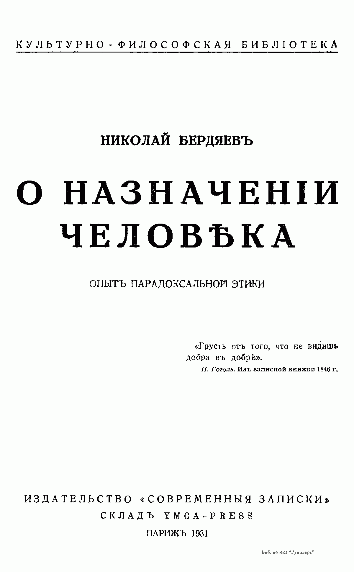 В работе "О назначении человека" Н.А. Бердяев выступает как представитель школы религиозного экзистенциализма, противопоставляя свободу духа объективной необходимости. Труд философа посвящен проблемам этического познания, проблемам свободы, личности и творчества, проблемам добра и зла. Бердяев различает три ступени этической эволюции: этику закона, этику искупления и этику творчества. Именно этика творчества, основанная на защите, переосмыслении и обновлении принципа свободной личности, является высшей и наиболее зрелой формой нравственного сознания.