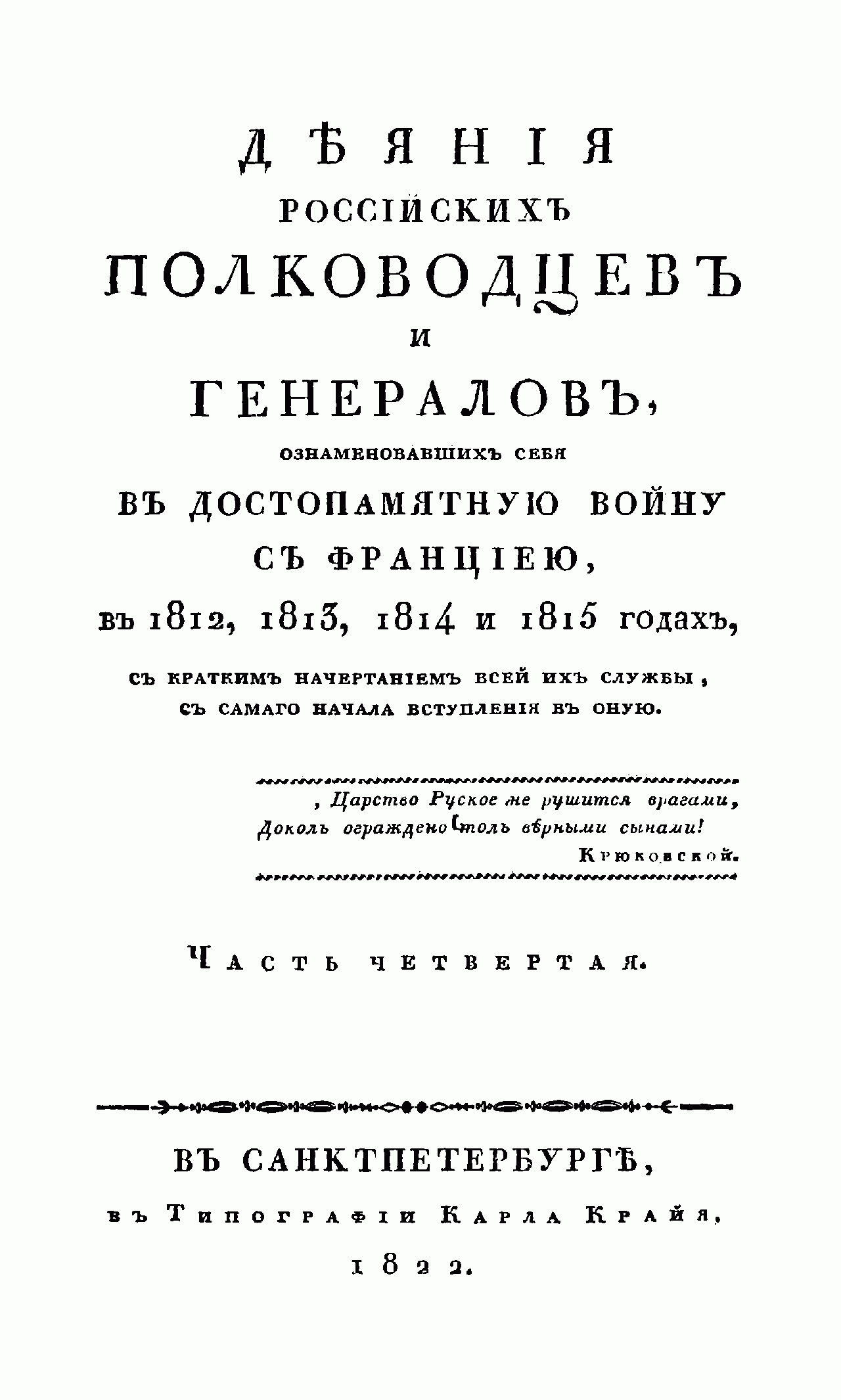 Деяния российских полководцев и генералов, ознаменовавших себя, в достопамятную войну с Францией, в 1812, 1813, 1814 и 1815 годах. Часть четвертая