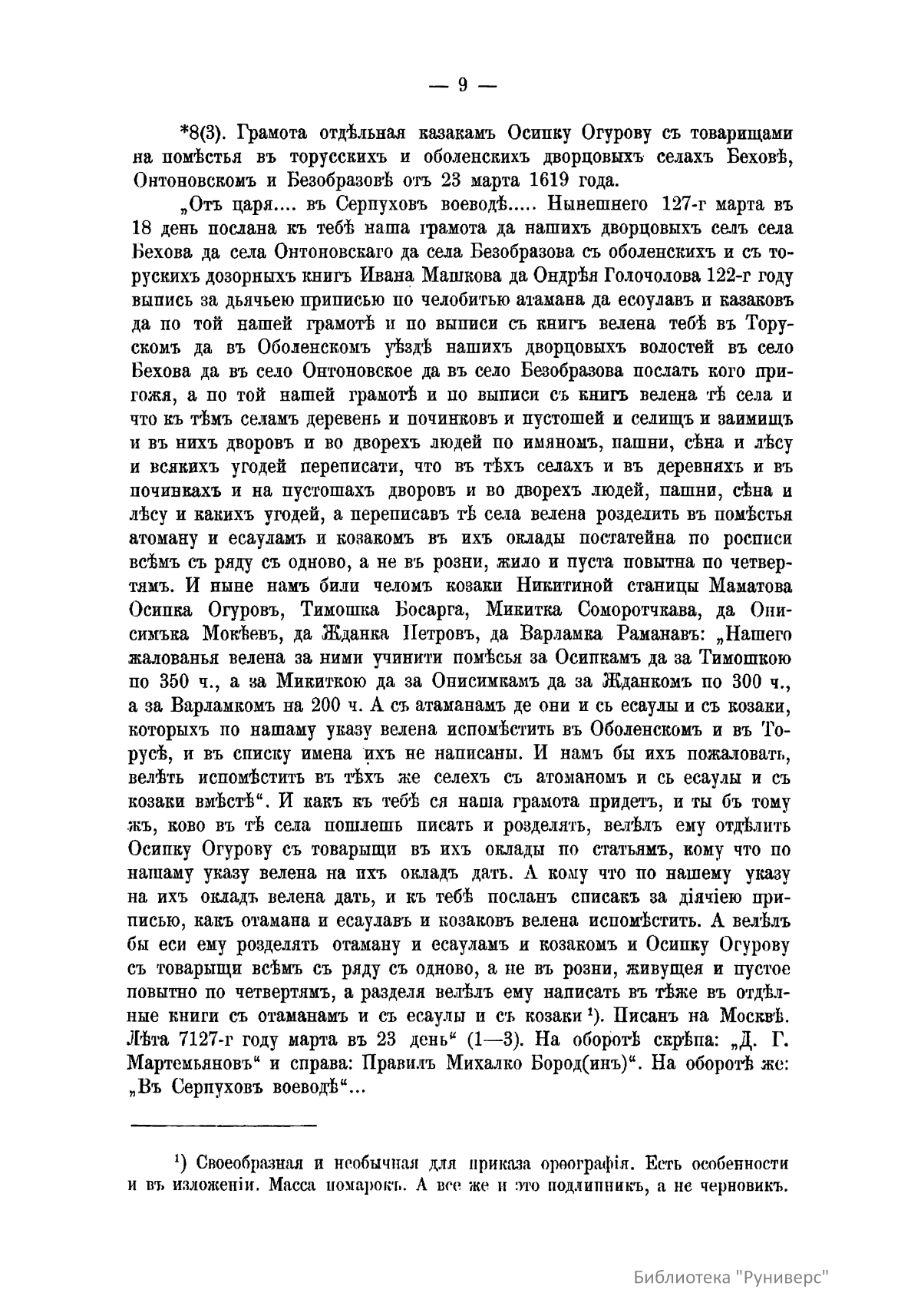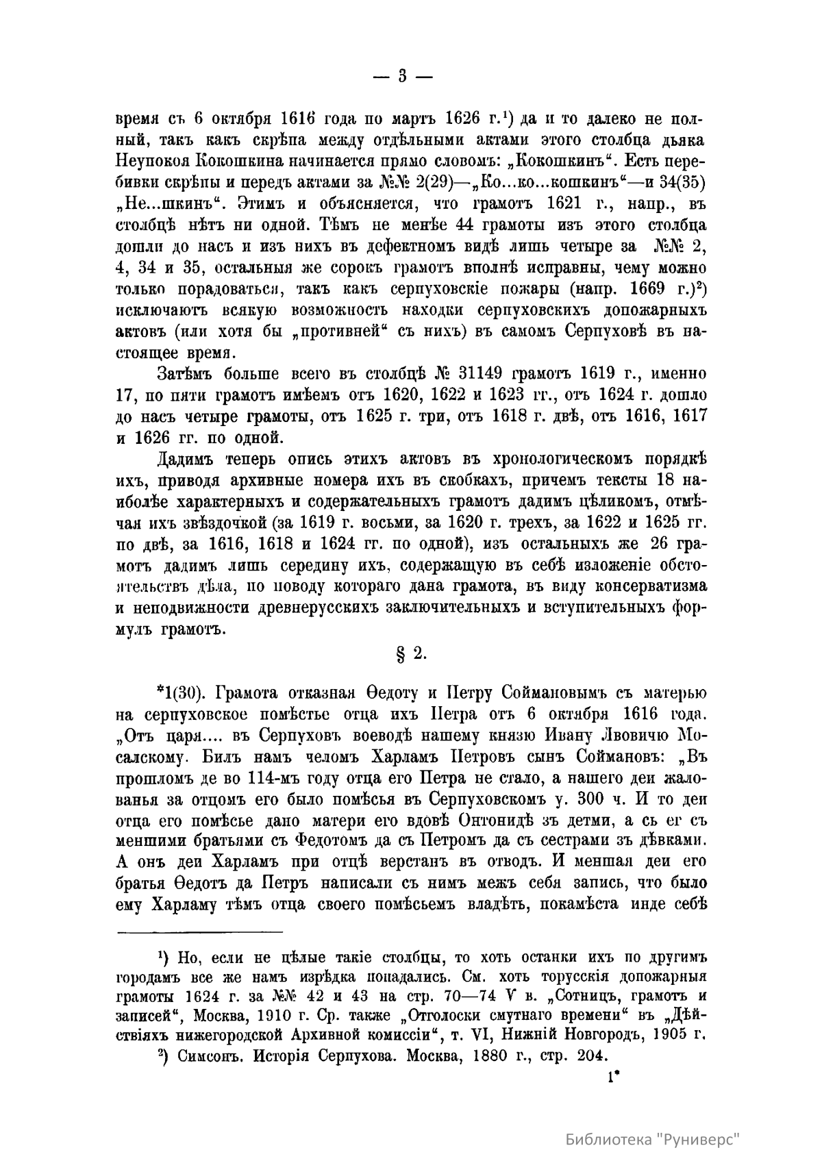 Опубликованные материалы представляют собой историческое исследование С.А. Шумакова, посвященные деятельности Поместного приказа и его документообороту в XVII веке. Автор анализирует последствия катастрофического пожара 1626 года, уничтожившего важнейшие архивы, и описывает процесс кропотливого восстановления указов и писцовых книг. В тексте приведен детальный перечень сохранившихся жалованных грамот, касающихся распределения земель между казаками и служилыми людьми в Серпуховском, Каширском и Тарусском уездах. Особое внимание уделено структуре ведомства, включая списки судей, дьяков и подьячих, а также разделению приказа на территориальные «столы». Исследование раскрывает тонкости земельного права того времени, описывая процедуры вотчинных споров, передачи поместий по наследству и наказаний за должностные преступления. Данный труд служит ценным источником по административной и социальной истории допетровской России.