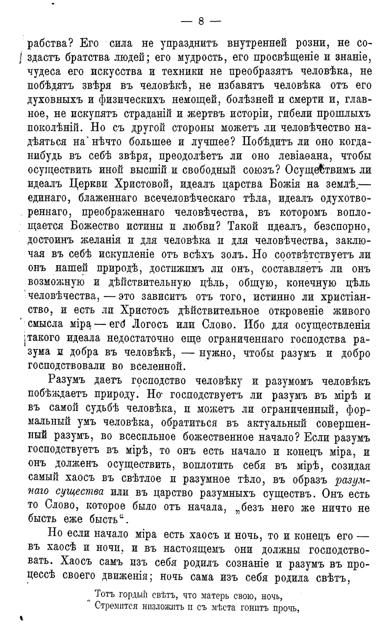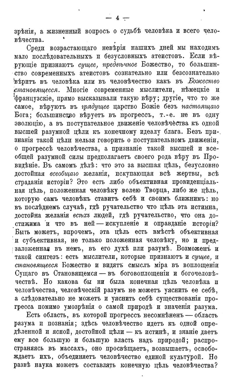 «Имеет ли какой-нибудь разумный смысл человеческая жизнь, и если да, то в чем он заключается? Имеет ли разумный смысл и разумную цель вся человеческая деятельность, вся история человечества и в чем этот смысл и цель? Имеет ли, наконец, разумную цель весь мировой процесс, имеет ли смысл существование вообще?» – вот главные вопросы, которые ставит философ и дает на них ответ.