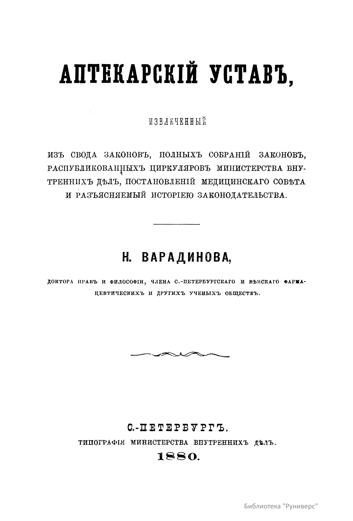 Издание представляет собой фундаментальный труд «Аптекарский устав», составленный доктором прав и философии Н. Варадиновым и изданный в 1880 году в типографии Министерства внутренних дел,.