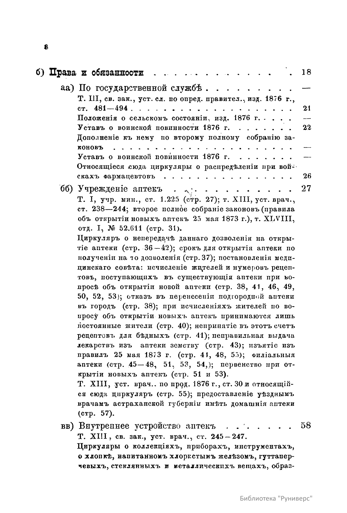 • Учреждение и устройство аптек: Приведены правила открытия новых аптечных заведений, нормы по количеству жителей и рецептов на одну аптеку, а также требования к внутреннему устройству помещений (лабораторий, материальных комнат, ледников),,,.