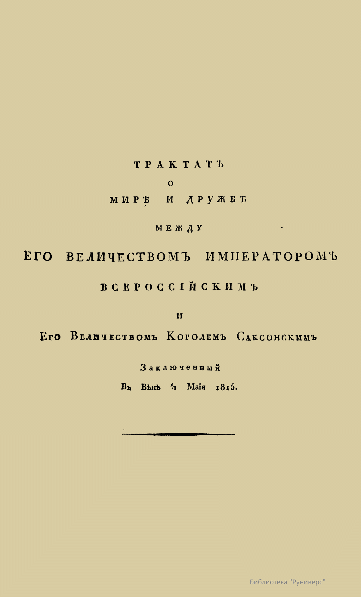ТРАКТАТЪ О МИРѢ И ДРУЖБѢ МЕЖДУ ЕГО ВЕЛИЧЕСТВОМЪ ИМПЕРАТОРОМЪ ВСЕРОССІЙСКИМЪ И Его Величествомъ Королемъ Саксонскимъ Заключенный Въ Вѣнѣ ⁶/₁₈ Маія 1815.