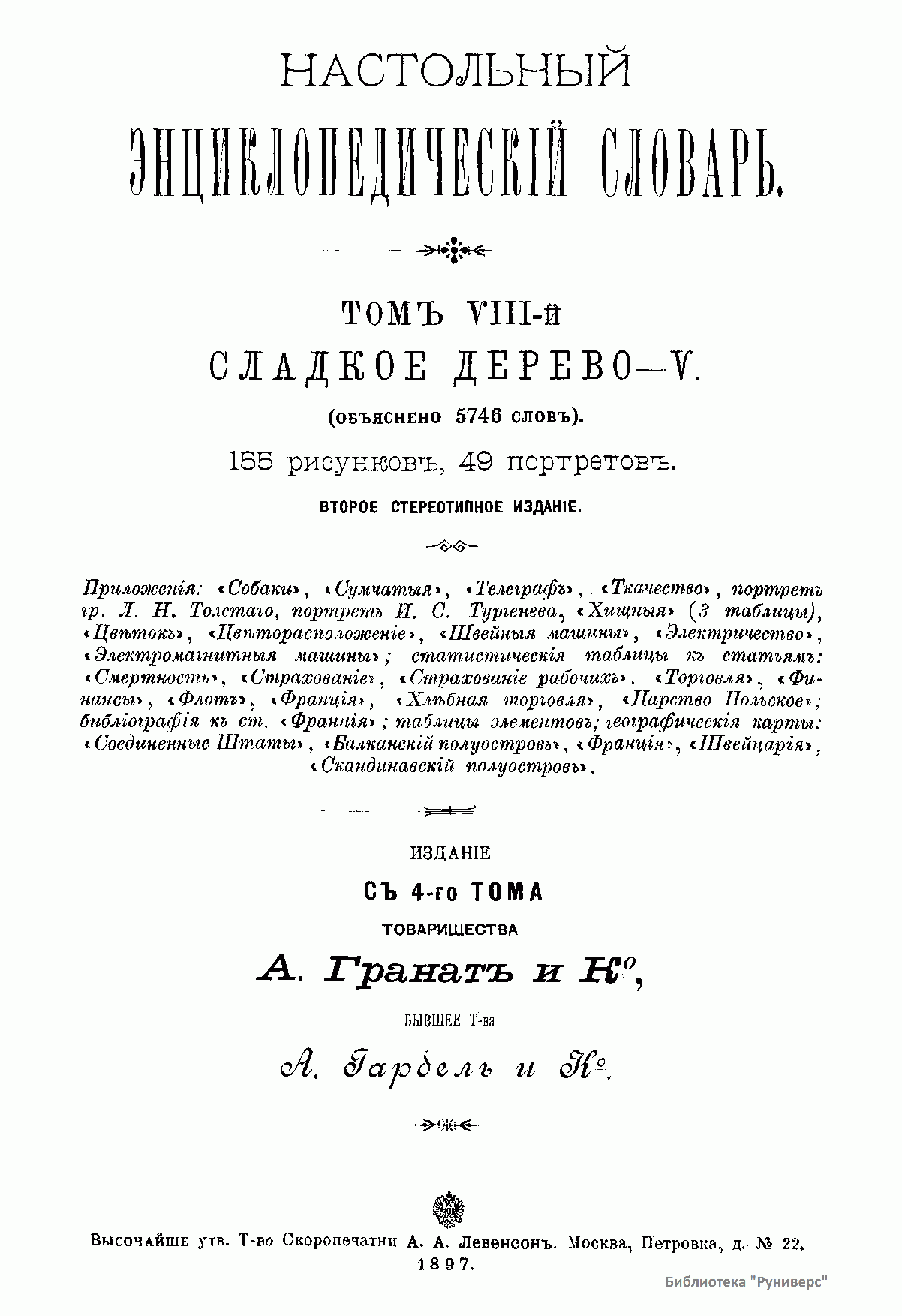 Настольный Энциклопедический Словарь "Гранат" - одна из крупнейших русских универсальных энциклопедий. В 1892 А. Гранат приобрёл издательские права на «Настольный энциклопедический словарь» товарищества "А. Гарбель и К°", выходивший в Москве с 1891, и с 4-го тома издание словаря было продолжено товариществом "А. Гранат и К°". Редакция поставила своей целью сделать Словарь не только справочною, но и образовательною книгою, стремилась, чтобы руководящие статьи заключали в себе весь тот минимум сведений, которым должен располагать образованный человек одинаково по всем отраслям знания. Все, касающееся России, излагалось полнее и всегда в тесной связи с жизнью и развитием других культурных народов. В справочном отделе на первом плане стояла точность, современность и полнота сведений по каждому из слов. Словарь касается всех областей знания: наука, техника, биология, география, этнография, археология, приведены статистические данные по странам и отраслям, биографические сведения и т.д. 8 томов словаря содержат 60 000 статей, 5358 страниц, свыше 1300 иллюстраций (в том числе цветных).