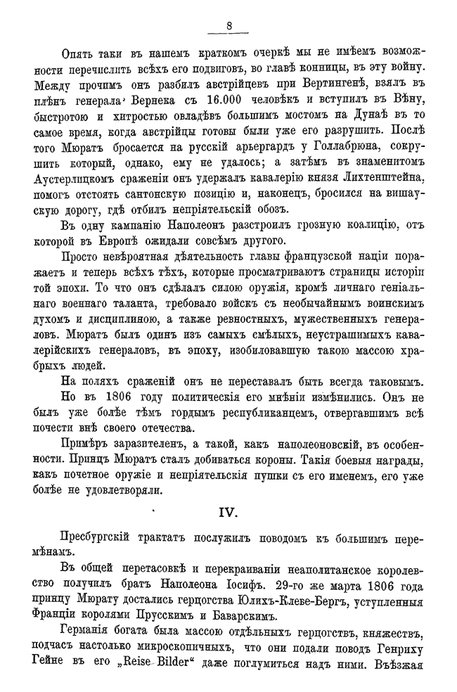 Небольшая брошюра – апологетическое описание жизни, доблестей и смерти знаменитого наполеоновского маршала. Ее автор к моменту издания – командир драгунского полка, затем – генерал, начальник Генерального штаба, а с марта 1909 по июнь 1915 года - военный министр России.