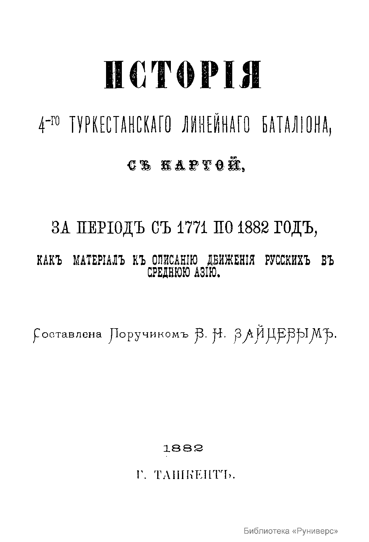Исторiя 4-го Туркестанскаго линейнаго баталiона, с картой, за периодъ съ 1771 по 1882 годъ, какъ матерiалъ къ описанiю движенiя русскихъ въ Среднюю Азiю