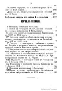 В предисловии к составленному военно-историческому очерка боевого пути 4-го Туркестанского линейного батальона его автор – поручик В.Н. Зайцев отмечает, что батальон, насчитывающий уже второе столетие своего существования, до сих пор «не имеет никаких данных о прошлом, которое по преданиям было крайне интересным и составило бы хороший предмет по боевому воспитанию современных борцов на окраине». «Желание познакомить чинов батальона с его боевой жизнью в походах от г. Оренбурга до настоящего места квартирования, близ китайской границы в г. Ош Ферганской области, дало мне мысль приступить к выборкам из трудно достававшихся источников и материалов по составлению истории». В данной книге вся боевая деятельность 4-го Туркестанского линейного батальона с момента его формирования до 1882 года разделена на три наиболее значительных периода. Первый период охватывает краткую хронику событий, связанных с формированием в августе 1771 года в оренбургской степи на базе гарнизона крепости Звериноголовск пограничного батальона в составе 5-ти рот и одной инвалидной команды. С этого момента и начинается история боевой деятельности батальона за 1771-1839 гг. Второй период боевой деятельности батальона включает события с 1839 по 1865 гг. описание участия батальона в Хивинском походе 1839-1840 гг., столкновениях с киргизами, сражении при Кум-суате, взятие крепостей Яны-Курган и Дин-Курган, взятие г. Туркестан, и, наконец, взятие Ташкента в июне 1865 года и основание русского Ташкента. Наконец, третий период охватывает 1865-1882 гг. В этой хронике описаны следующие события: поход через голодную степь к Джизаку, взятие Джизака в 1866 году, сражение под Самаркандом на Чупанатинских высотах, Хивинская экспедиция в 1873 году, штурм Андижана в 1873 году, покорение Кокандского ханства в 1875-1876 гг., а также участие в экспедициях в Алайские горы до кашгарской границы в 1876, 1877 и 1878 гг. Приложения к очерку включают списки командиров батальона и офицеров, служивших с 1839 по 1882 гг., а также список награжденных орденом святого Георгия и нижних чинов, награжденных знаком отличия Военного ордена, а также документы административно-хозяйственного содержания.