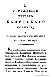 Краткая исторiя перваго кадетскаго корпуса