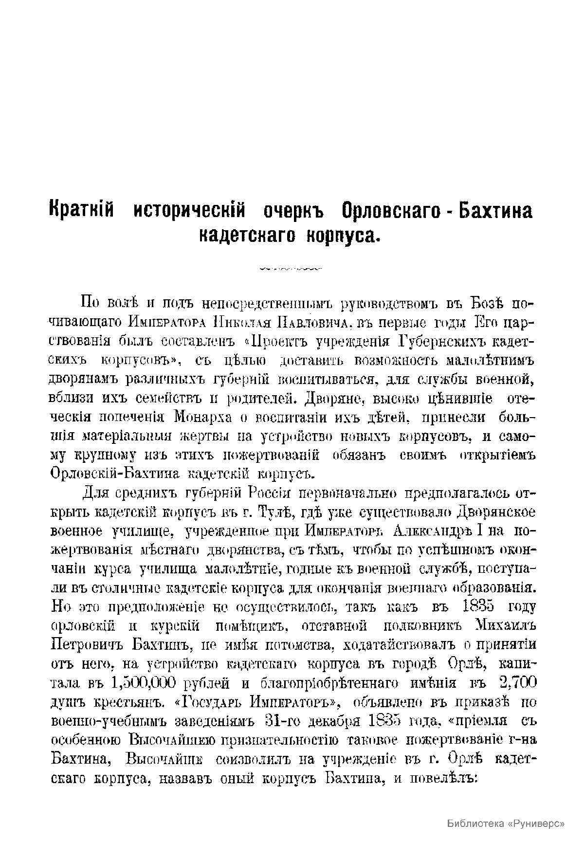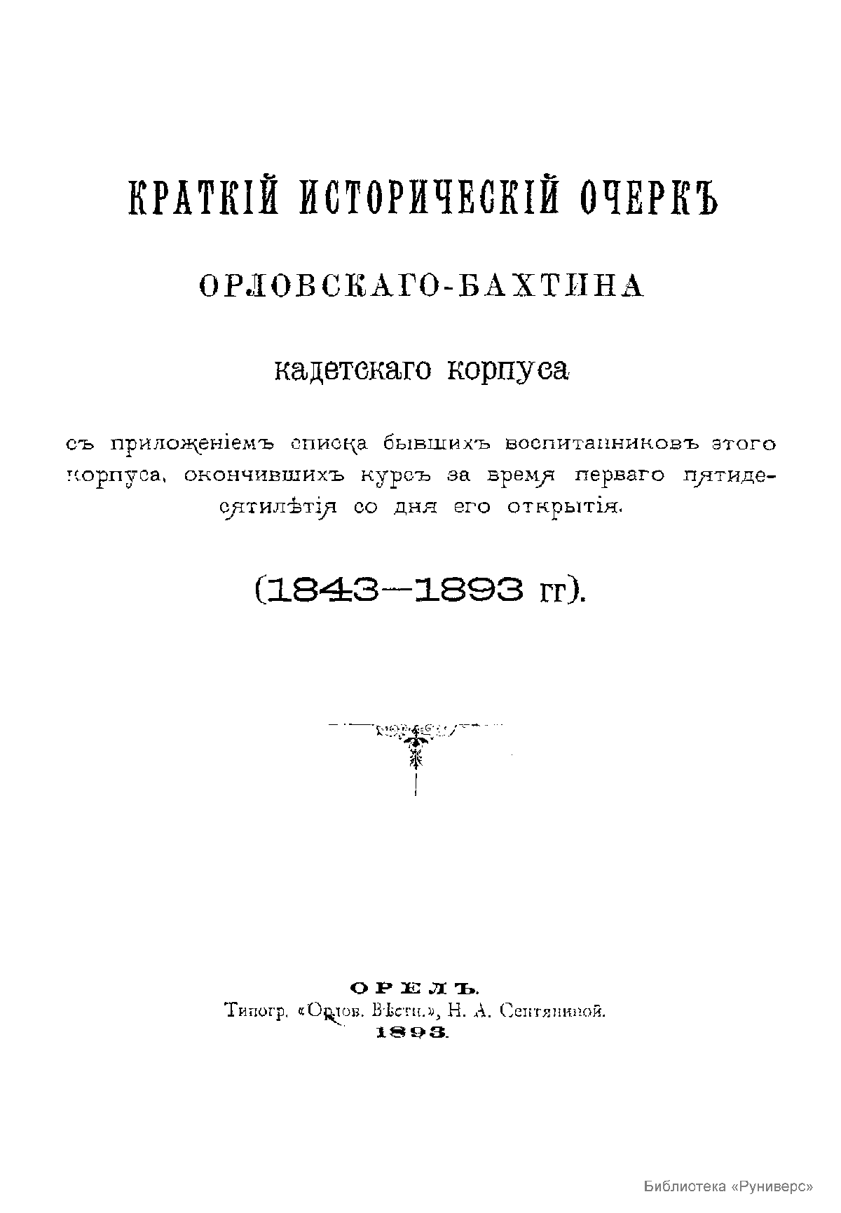 Краткiй историческiй очеркъ Орловскаго-Бахтина кадетскаго корпуса, съ приложенiемъ списка бывшихъ воспитанниковъ этого корпуса, окончившихъ курсъ за время перваго пятидесятилѣтiя со дня его открытiя. (1843-1893 гг.)