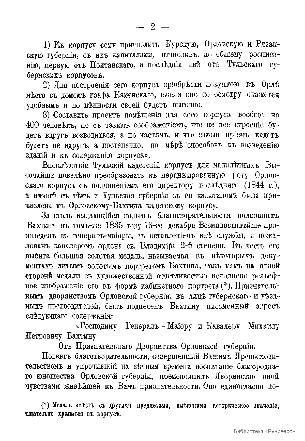 Очерк истории Орловского Бахтина кадетского корпуса был подготовлен в связи с празднованием 50-летия с момента его основания. Автором очерка является известный общественный деятель эпохи реформ Александра II, один из ближайших сотрудников военного министра графа Д.А. Милютина, генерал от артиллерии Матвей Степанович Лалаев, выходец из армянского рода, посвятивший долгие годы жизни организации военного образования в России. Перу этого известного военного ученого принадлежит также двухтомный капитальный труд по истории русских военно-учебных заведений «Исторический очерк военно-учебных заведений, подведомственных Главному их Управлению. От основания в России военных школ до исхода первого двадцатипятилетия благополучного царствования государя императора Александра Николаевича: 1700 – 1880.», изданный в Петербурге в 1880 г. Кадетские корпуса в России, помимо столичного Первого «шляхетского» кадетского корпуса были также организованы и за пределами Санкт-Петербурга, из губернских дворянских училищ, подготавливавших дворянских отпрысков к государственной службе. В 1830 г. было издано «Положение о губернских кадетских корпусах». К этому времени усилился приток денежных средств от провинциального дворянства, к которому еще в 1801 г. обратился Александр I с призывом оказать помощь в создании учебных заведений для детей дворян. В этом же году был составлен проект учреждения для центральных «средних» губерний России кадетского корпуса в г. Туле, где уже существовало Дворянское военное училище, основанное Александром I. Но в 1835 году, один из богатейших брянских и орловских помещиков бездетный полковник в отставке Михаил Петрович Бахтин, бывший командиром Псковского драгунского полка, пожертвовал на учреждение кадетского корпуса в городе Орле капитал в 1.500.000 рублей ассигнациями и имения с 2700 душ крестьян. Император Николай I, принял это пожертвование, повелел новый корпус наименовать «корпусом Бахтина», произвёл Бахтина в чин генерал-майора с зачислением на службу и пожаловал ему орден святого Владимира 2-й степени. В честь щедрого жертвователя была выбита большая золотая медаль с рельефным его изображением и надписью на обороте: «За благотворение юношеству 1836». Впоследствии Бахтин пожертвовал на корпус ещё капитал в 140 тысяч рублей ассигнациями. Затем, по ходатайству Бахтина, его родовое имение было приобретено в казну, и вырученную сумму он передал, по особому акту, Орловскому же кадетскому корпусу. Бахтин скончался 27 января 1838 года, не дожив до открытия кадетского корпуса. На его могиле в селе Барышье Брянского уезда, рядом с построенной им церковью Козьмы и Домиана, был установлен весьма примечательный памятник, увенчанный крестом с фигурой ратника ополчения, на пьедестале выбит текст о пожертвованиях для корпуса. 1 сентября 1837 г. состоялась торжественная церемония закладки основного здания Орловского кадетского корпуса, происходило это в присутствии наследника престола цесаревича – будущего императора Александра II, в то время путешествовавшего по России. 19 декабря 1843 г. корпус был освящен и открыт, и это стало большим событием для города. Четырехэтажное здание корпуса в плане представляло собой букву "Н", являлось самым крупным и красивым в городе, имело в себе церковь, посвященную Архистратигу Михаилу. Еще в мае 1843 г. п