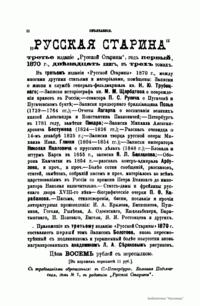 «Русская старина», ежемесячный исторический журнал, выходил в Петербурге в 1870-1918. Основан, издавался и редактировался (1870-1892) М. И. Семевским при участии В. И. Семевского. Последующими редакторами были Н. К. Шильдер (1892-1896), Н. Ф. Дубровин (1896-1904), военные историки С. П. Зыков, П. Н. Воронов.