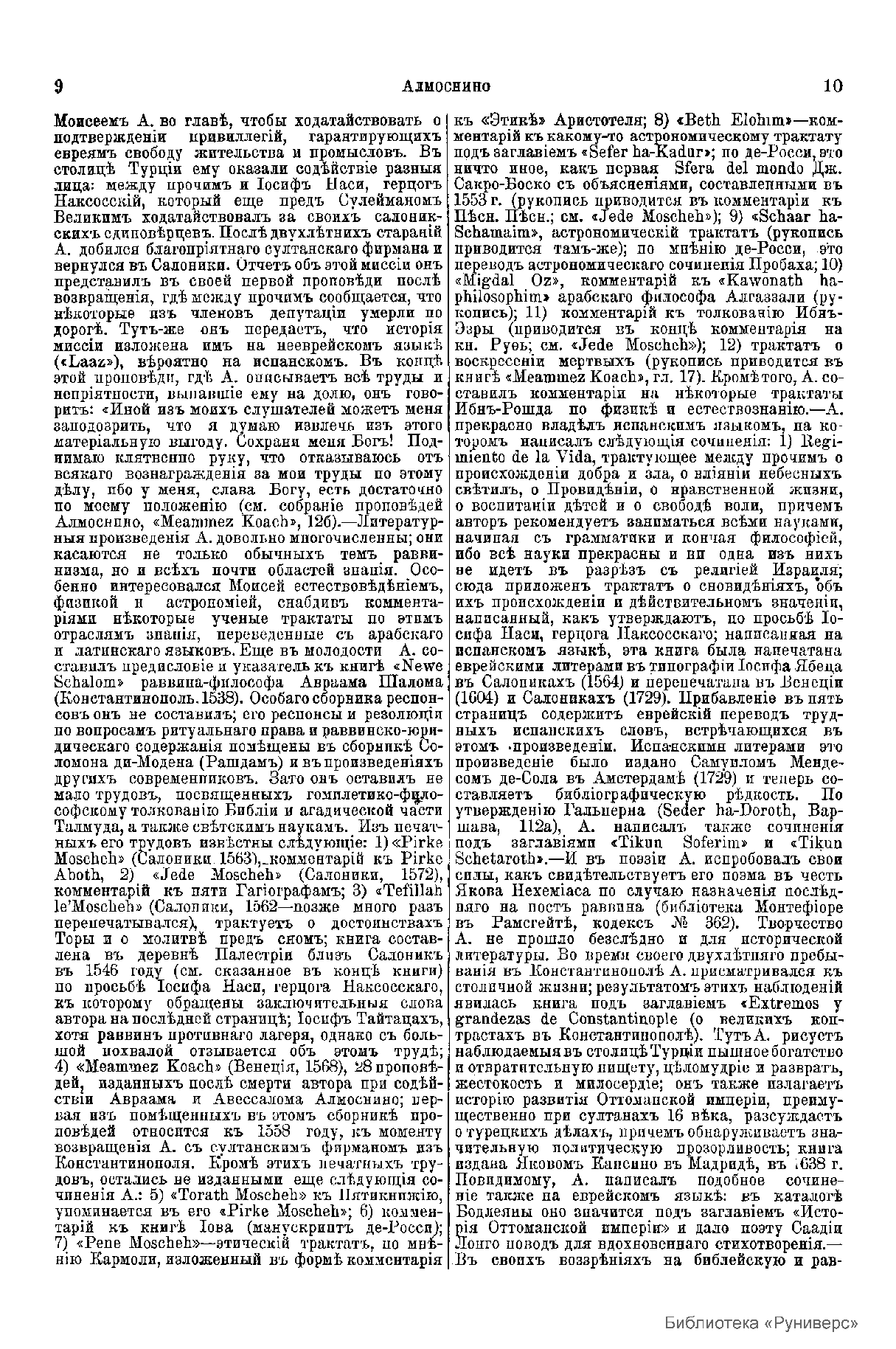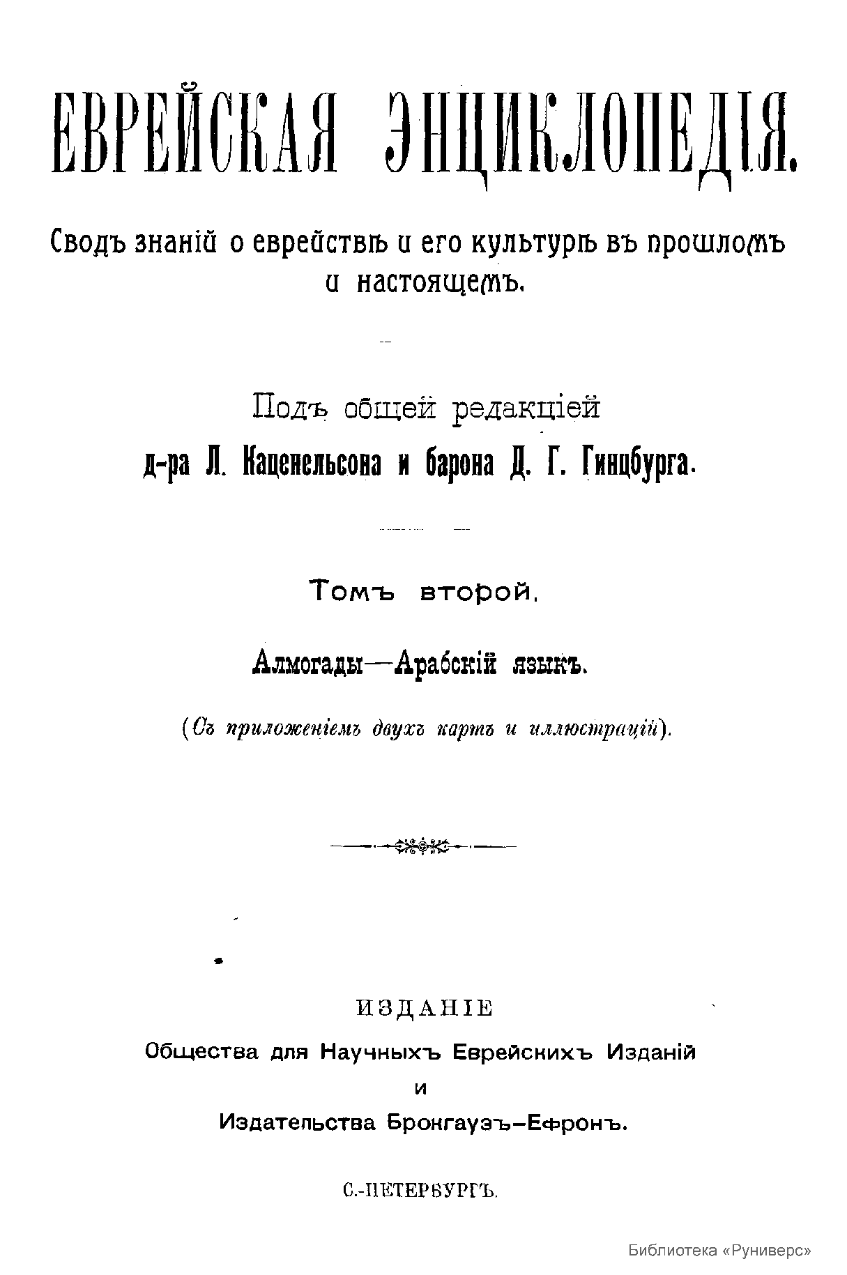 Первый крупный энциклопедический свод знаний о еврействе на русском языке. Энциклопедия была опубликована в 1908 – 1913 гг. в шестнадцати томах в Санкт-Петербурге «Обществом для научных еврейских изданий» и «Издательством Брокгауз – Ефрон». Основой и образцом для нее послужила вышедшая несколько годами ранее двенадцатитомная «The Jewish Encyclopedia» (London; New York, 1901 – 1906). Однако ее материал был существенно дополнен и расширен авторами «Еврейской Энциклопедии Брокгауза» во всем, что касалось истории, культуры и современного положения еврейских общин в Восточной Европе. В работе над «Еврейской энциклопедией Брокгауза» принимали участие виднейшие представители российской иудаики, гебраистики и востоковедения: А.Гаркави, Д. Гинцбург, Ю Гессен, С. Дубнов, И. Маркон, Н. Переферкович. «Еврейская энциклопедия Брокгауза» до сих пор остается одним из важнейших источников справочной информации и статистических данных о почти шестимиллионном еврейском населении Российской империи начала XX в. И потому ее данные можно отнести к числу ценных источников сведений по социально-политической, этнической, культурно-религиозной истории и исторической демографии России и сопредельных ей стран.