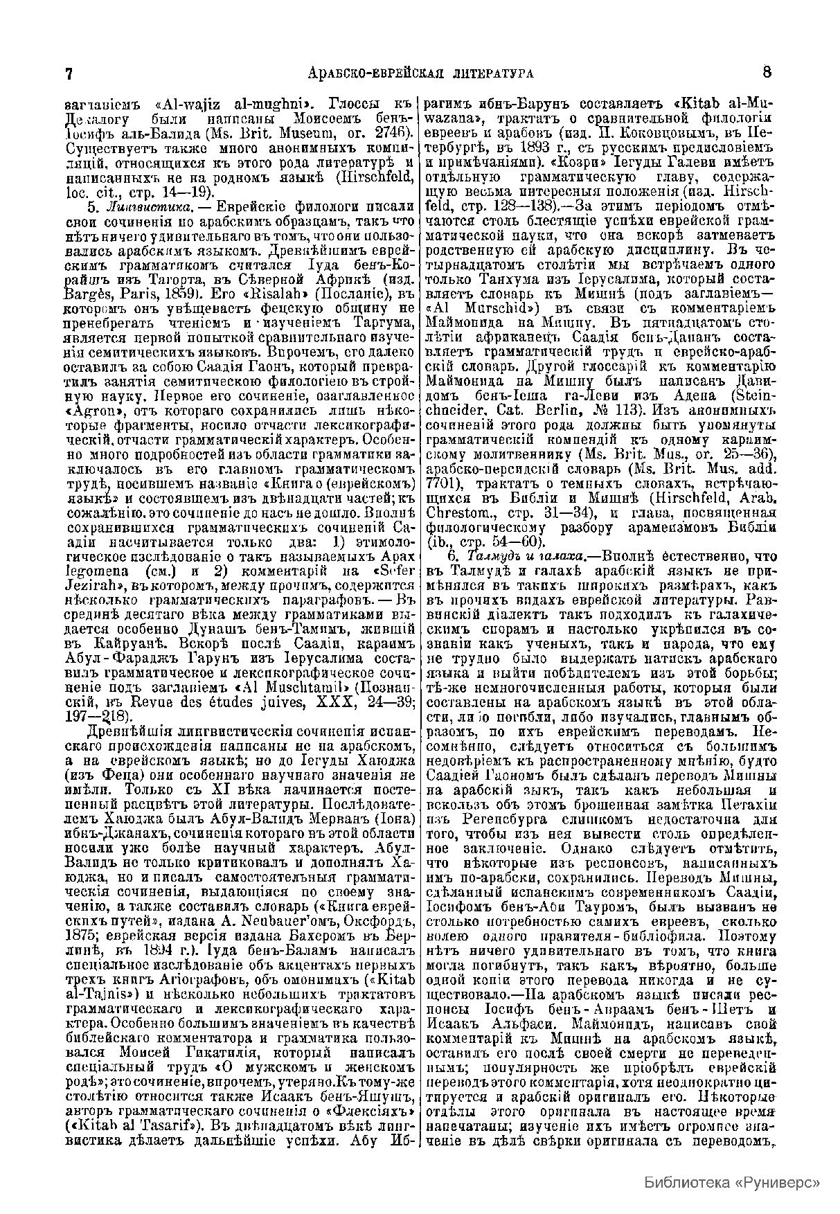 Первый крупный энциклопедический свод знаний о еврействе на русском языке. Энциклопедия была опубликована в 1908 – 1913 гг. в шестнадцати томах в Санкт-Петербурге «Обществом для научных еврейских изданий» и «Издательством Брокгауз – Ефрон». Основой и образцом для нее послужила вышедшая несколько годами ранее двенадцатитомная «The Jewish Encyclopedia» (London; New York, 1901 – 1906). Однако ее материал был существенно дополнен и расширен авторами «Еврейской Энциклопедии Брокгауза» во всем, что касалось истории, культуры и современного положения еврейских общин в Восточной Европе. В работе над «Еврейской энциклопедией Брокгауза» принимали участие виднейшие представители российской иудаики, гебраистики и востоковедения: А.Гаркави, Д. Гинцбург, Ю Гессен, С. Дубнов, И. Маркон, Н. Переферкович. «Еврейская энциклопедия Брокгауза» до сих пор остается одним из важнейших источников справочной информации и статистических данных о почти шестимиллионном еврейском населении Российской империи начала XX в. И потому ее данные можно отнести к числу ценных источников сведений по социально-политической, этнической, культурно-религиозной истории и исторической демографии России и сопредельных ей стран.