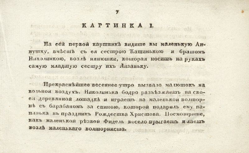 Через все повествование проходит одна и та же героиня, в нашем случае – девочка Аннушка, «добрая, рачительная девочка». Каждая иллюстрация разделена на две части: на одной – изображен тот сюжет, о котором пойдет речь в рассказе, а на второй – всегда изображаются те предметы, название и предназначение которых автор хотел бы сделать доступными для детей. Аннушка то подает еду бедному человеку – так ей подсказывает ее «доброе и человеколюбивое» сердце, то рассматривает принесенные с рынка овощи и плоды, то «пособляет поварихе». Везде героиню окружает множество предметов. Они-то и изображены на каждой иллюстрации отдельно для более подробного изучения и запоминания: кухонная утварь, домашняя посуда, предметы, необходимые для стирки и пр.