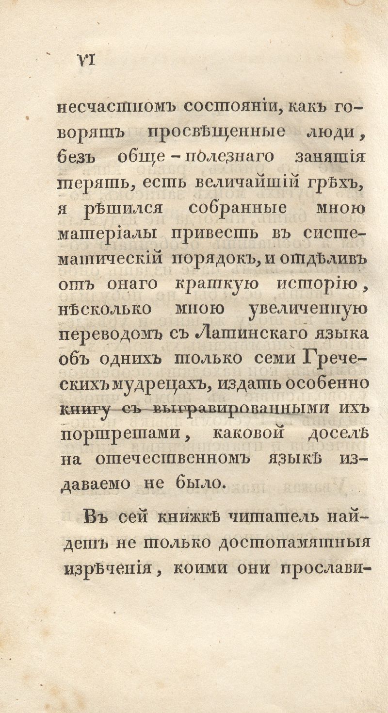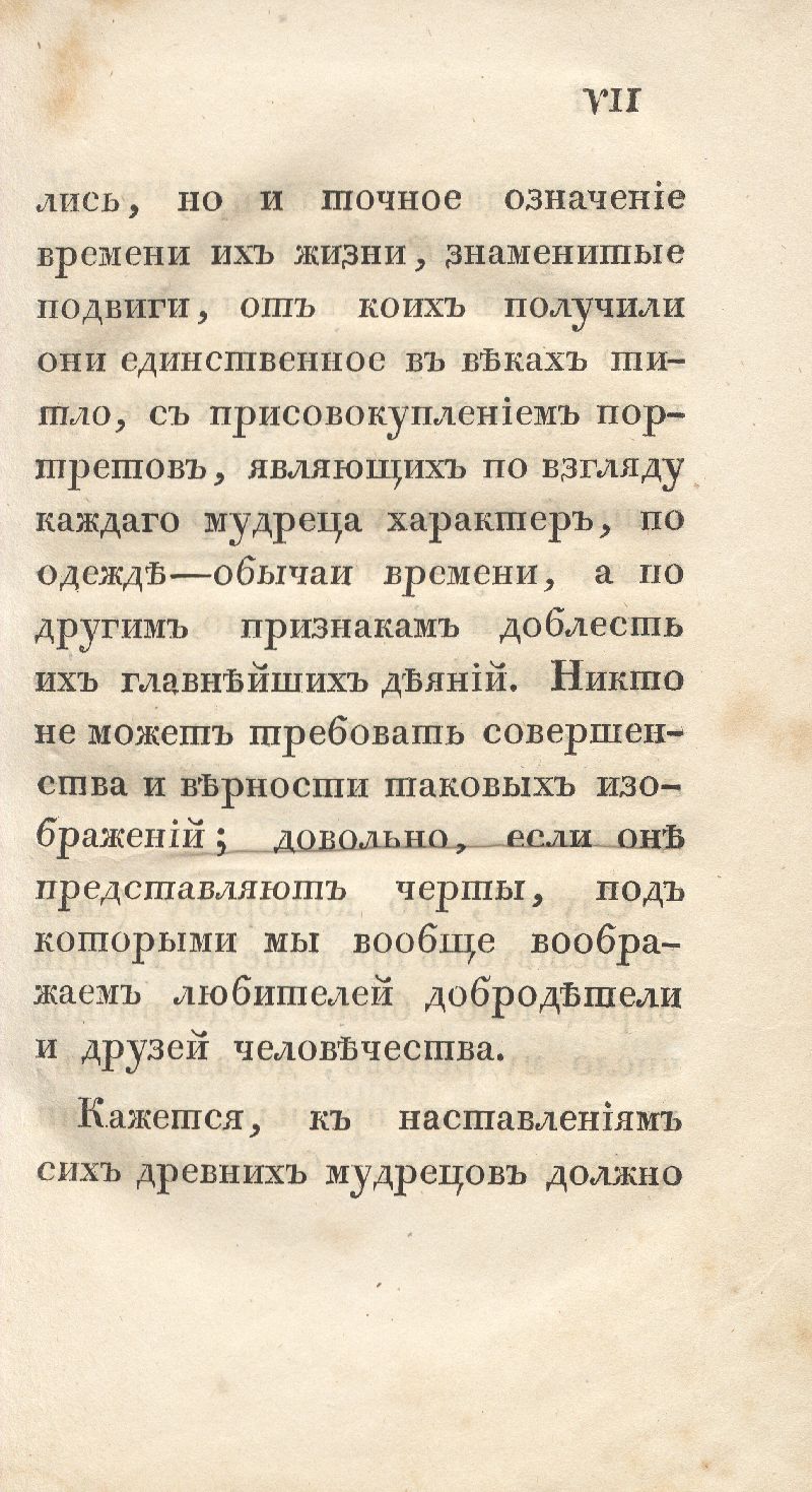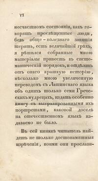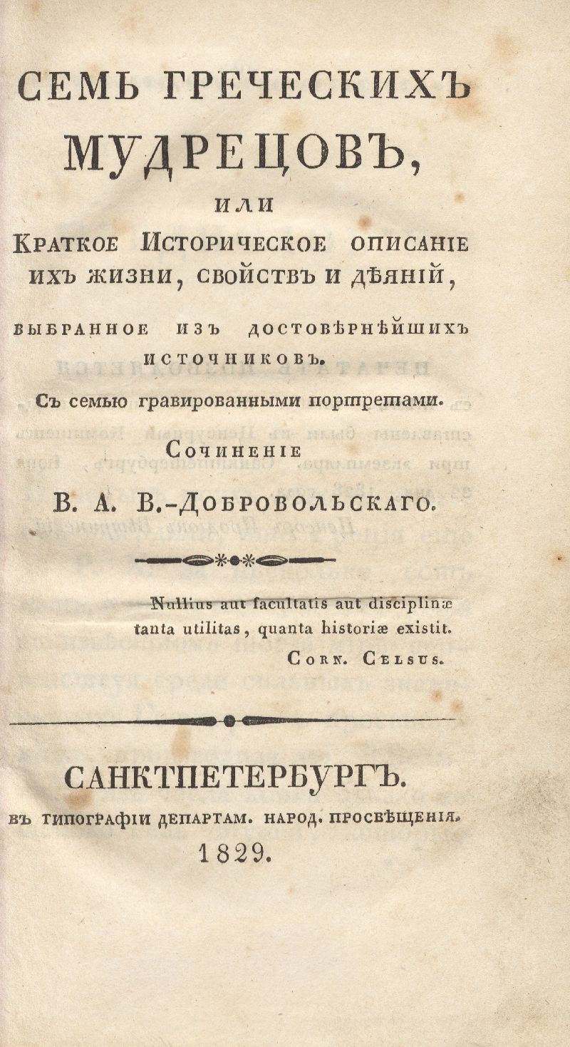 Издание «Семь греческих мудрецов, или Краткое историческое описание их жизни, свойств и деяний...», как явствует из «Предисловия» автора, «доселе на отечественном языке издаваемо не было». И это действительно так. Автор пишет, что «нравственные и исторические книги» желаемы многими, а это значит, что читатель той эпохи испытывал недостаток в такого рода чтении. Выбрав из истории Греции семь мужей, которые удостоились «названия Мудрых», автор сложил для юного читателя небольшую книгу из семи рассказов. Каждый включал в себя известные изречения каждого из семи мудрецов, краткую биографию с указанием подвигов и приложением портретов, которые, несомненно, были условными.
