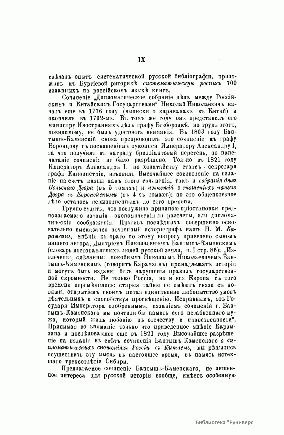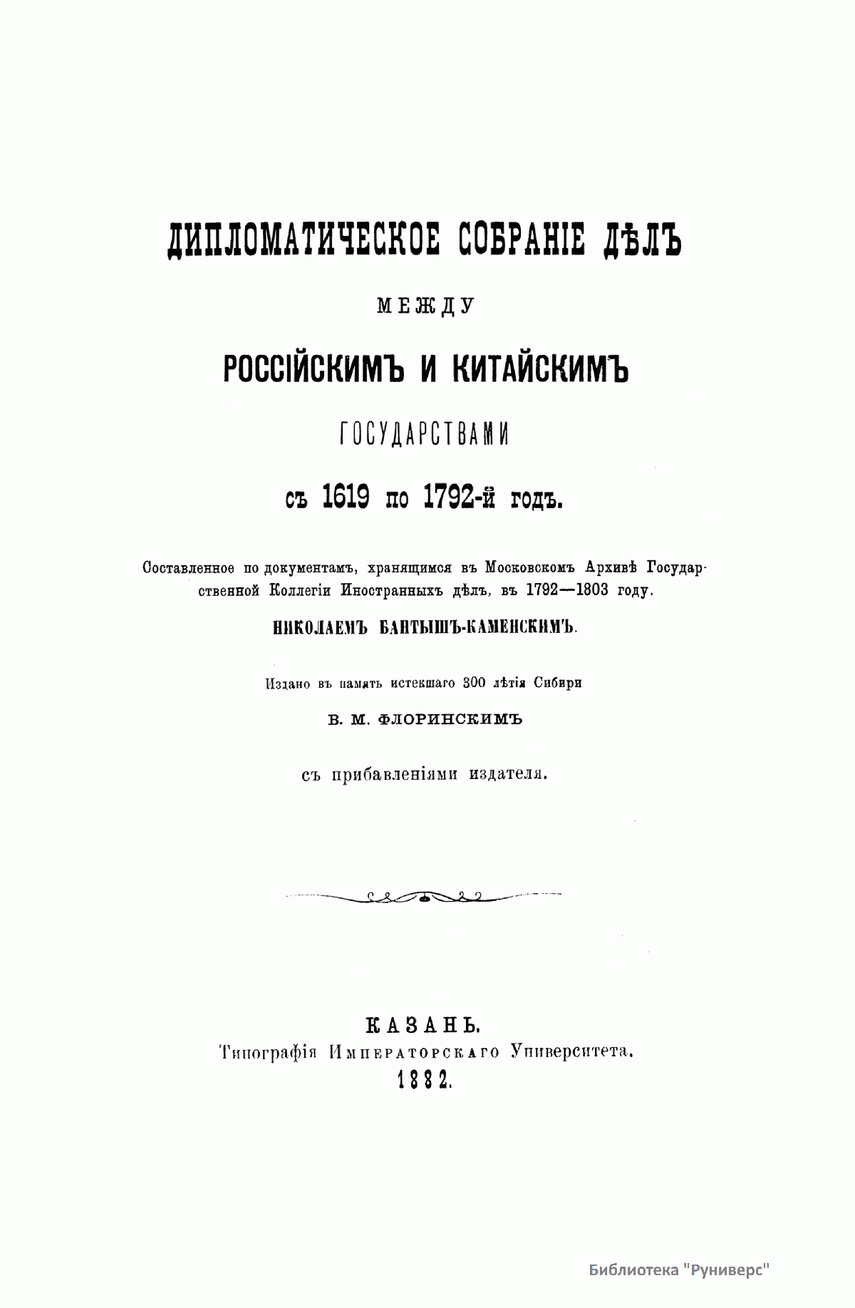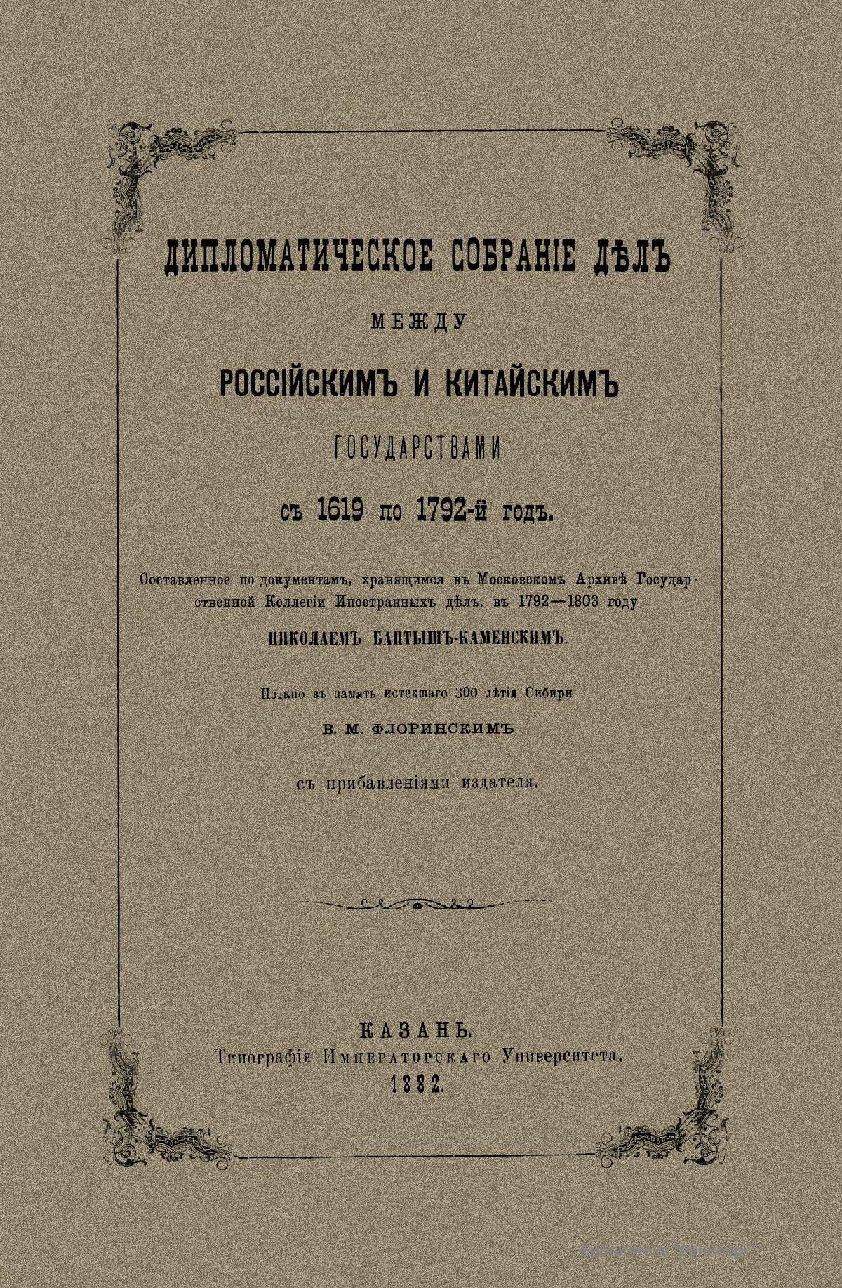 Представленное юбилейное издание, выпущенное в честь 300-летия Сибири В. М. Флоринским, достойно пристального внимания. Оно было написано еще в 1792 году известным историком, археографом Николаем Николаевичем Бантыш-Каменским (1737–1814) на основе редких документов, хранившихся в архиве Государственной коллегии иностранных дел. Высочайшее разрешение на печать книги за счет казны было получено по ходатайству статс-секретаря графа Каподистрии от императора Александра I в 1821 году. Но раскрытие дипломатических тайн не состоялось. Посмертное издание было осуществлено только в 1882 году. Оно недаром приурочено к 300-летию Сибири, так как имеет большое значение для изучения сибирской истории, взаимного влияния двух обширных государств в культурной, духовной жизни и в экономике. Политические отношения с Китаем во все времена представляли сложность для дипломатических миссий, но в данном сочинении можно найти ответы на многие поставленные вопросы, потому что, по словам В. М. Флоринского, «…опыт прошедшего есть лучший учитель для настоящего и будущего». В приложении содержатся документы: грамоты, договоры, свидетельства, письма, реестры, трактаты и инструкции.