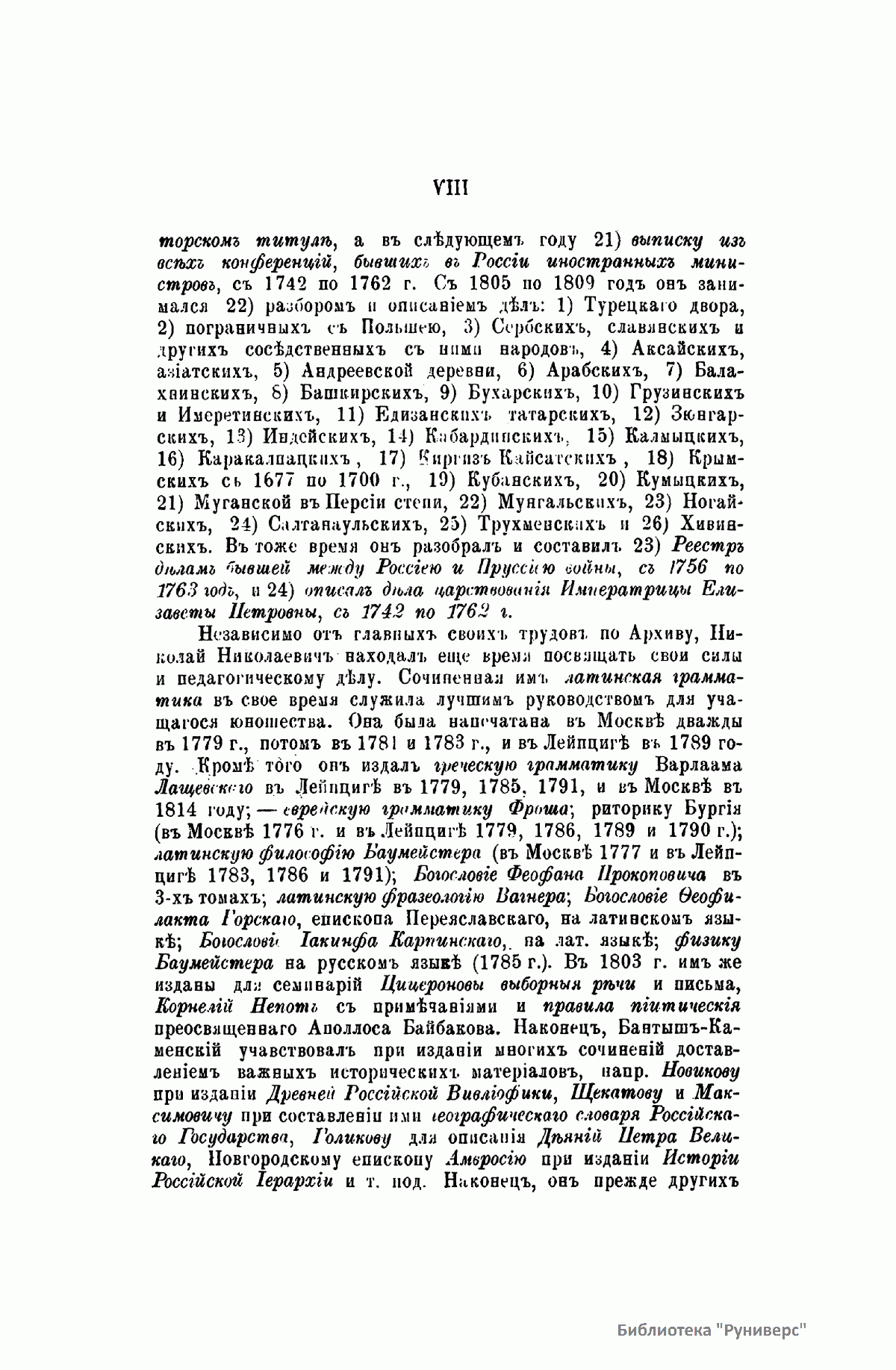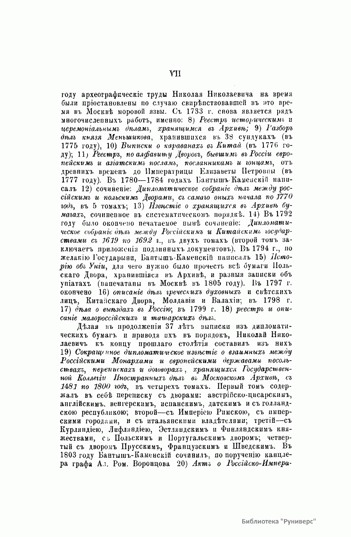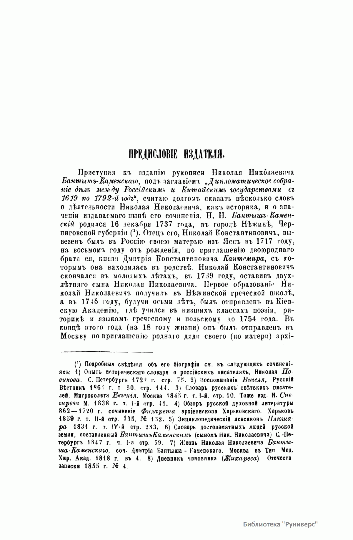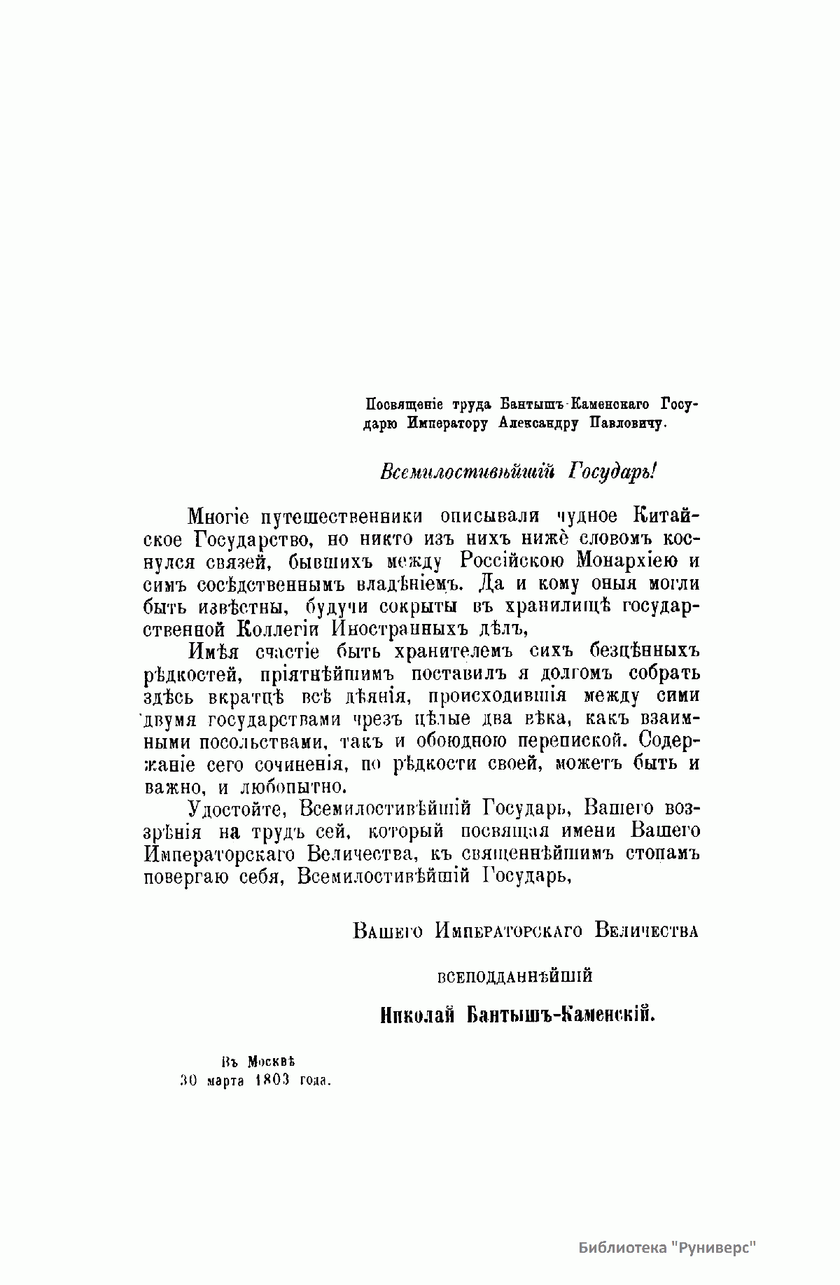 Представленное юбилейное издание, выпущенное в честь 300-летия Сибири В. М. Флоринским, достойно пристального внимания. Оно было написано еще в 1792 году известным историком, археографом Николаем Николаевичем Бантыш-Каменским (1737–1814) на основе редких документов, хранившихся в архиве Государственной коллегии иностранных дел. Высочайшее разрешение на печать книги за счет казны было получено по ходатайству статс-секретаря графа Каподистрии от императора Александра I в 1821 году. Но раскрытие дипломатических тайн не состоялось. Посмертное издание было осуществлено только в 1882 году. Оно недаром приурочено к 300-летию Сибири, так как имеет большое значение для изучения сибирской истории, взаимного влияния двух обширных государств в культурной, духовной жизни и в экономике. Политические отношения с Китаем во все времена представляли сложность для дипломатических миссий, но в данном сочинении можно найти ответы на многие поставленные вопросы, потому что, по словам В. М. Флоринского, «…опыт прошедшего есть лучший учитель для настоящего и будущего». В приложении содержатся документы: грамоты, договоры, свидетельства, письма, реестры, трактаты и инструкции.