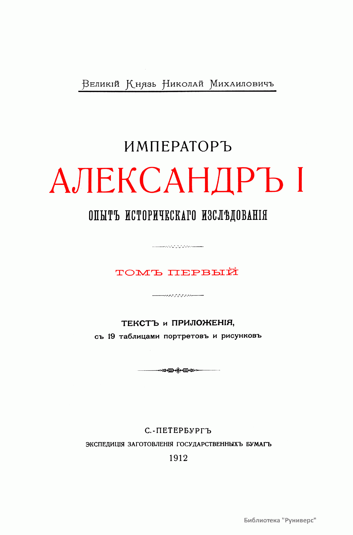 Великий князь Николай Михайлович – автор многих исторических трудов, посвященных эпохе Александра I и наполеоновских войн. «Император Александр I. Опыт исторического исследования» в двух томах (на французском языке. СПб., 1912. 2-е изд., 1914) – наиболее фундаментальный из них. Несмотря на обилие исторической литературы об эпохе Александра I, эта книга явилась новым словом в науке. Новизна ее состояла в том, что Николай Михайлович использовал много ранее недоступных материалов, хранящихся в секретных государственных архивах, на пользование которыми мог дать разрешение только император. Ему такое разрешение давалось. Естественно, доступ к закрытым архивам позволил по-иному проанализировать те или иные обстоятельства жизни Александра I. Также и все другие исследования александровской эпохи писались им с подобным изучением архивов и открыли много новых исторических фактов. В предисловии к изданию автор говорит о том, что стремился дать опыт исторического исследования характера и деятельности Александра Павловича не только как государя и повелителя земли русской, но и как человека. Кроме того, автор заявляет о своей беспристрастности: «…Мы даем материалы, которыми будущие русские историки могут воспользоваться. Не нам также решать вопрос, возвеличит или понизит предлагаемое исследование образ монарха». Первый том охватывает период с 1801 по 1825 год, содержит приложения и 46 иллюстраций. Во втором томе находятся различные документы и письма.