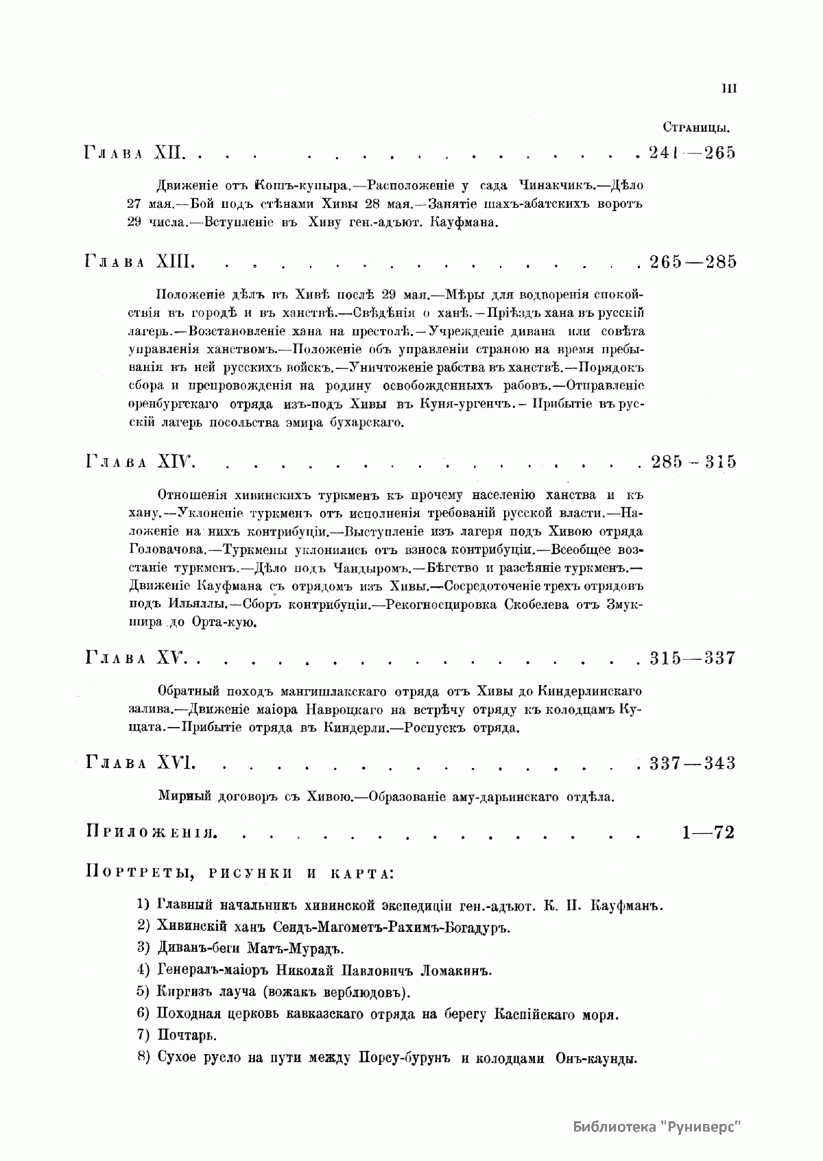 Данное издание представляет собой описание событий Хивинского похода 1873 года. Автор книги Гродеков Н. И. являлся участником военной экспедиции в качестве начальника штаба Мангышлакского отряда полковника Ломакина и за боевые отличия был награжден орденом св. Станислава 2-ой степени. Основные события похода, включая сравнительную оценку разных известных до военных действий путей, автор превосходно описал в данной книге. Издание было значительно дополнено двумя главами, портретами главных деятелей войны, рисунками, планом города Хивы, что дает возможность рассмотреть картину похода со всех сторон.