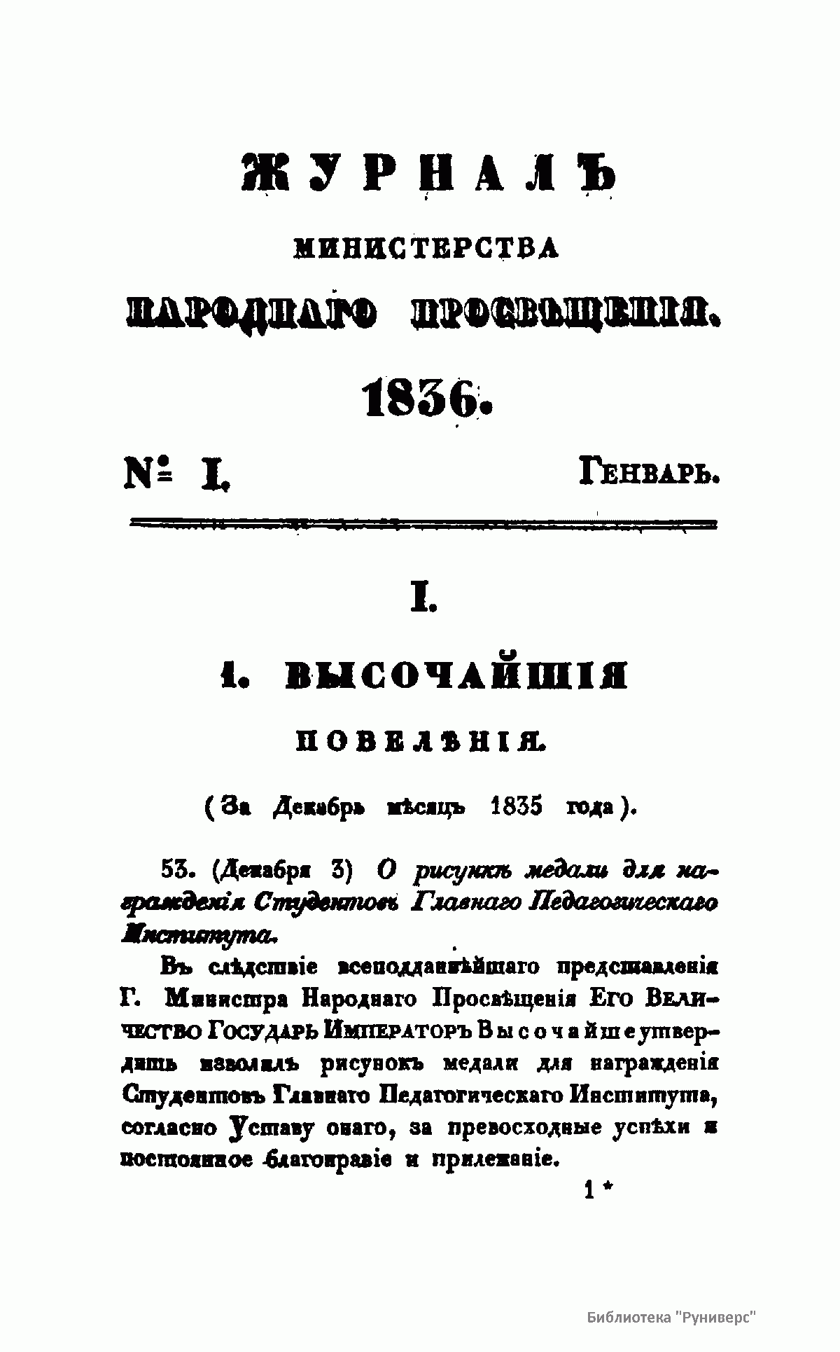 Журнал Министерства народного просвещения выходил с 1834-го по 1917 год. Официальный периодический журнал об успехах просвещения в России. Издатели журнала уверены в том, что «если для каждого человека необходим выход из грубой тьмы невежества и беспрерывное дальнейшее движение к свету, то для народов необходимо попечительное участие правительства в образовании. Только правительство имеет все средства знать и высоту успехов всемирного образования, и настоящие нужды Отечества».