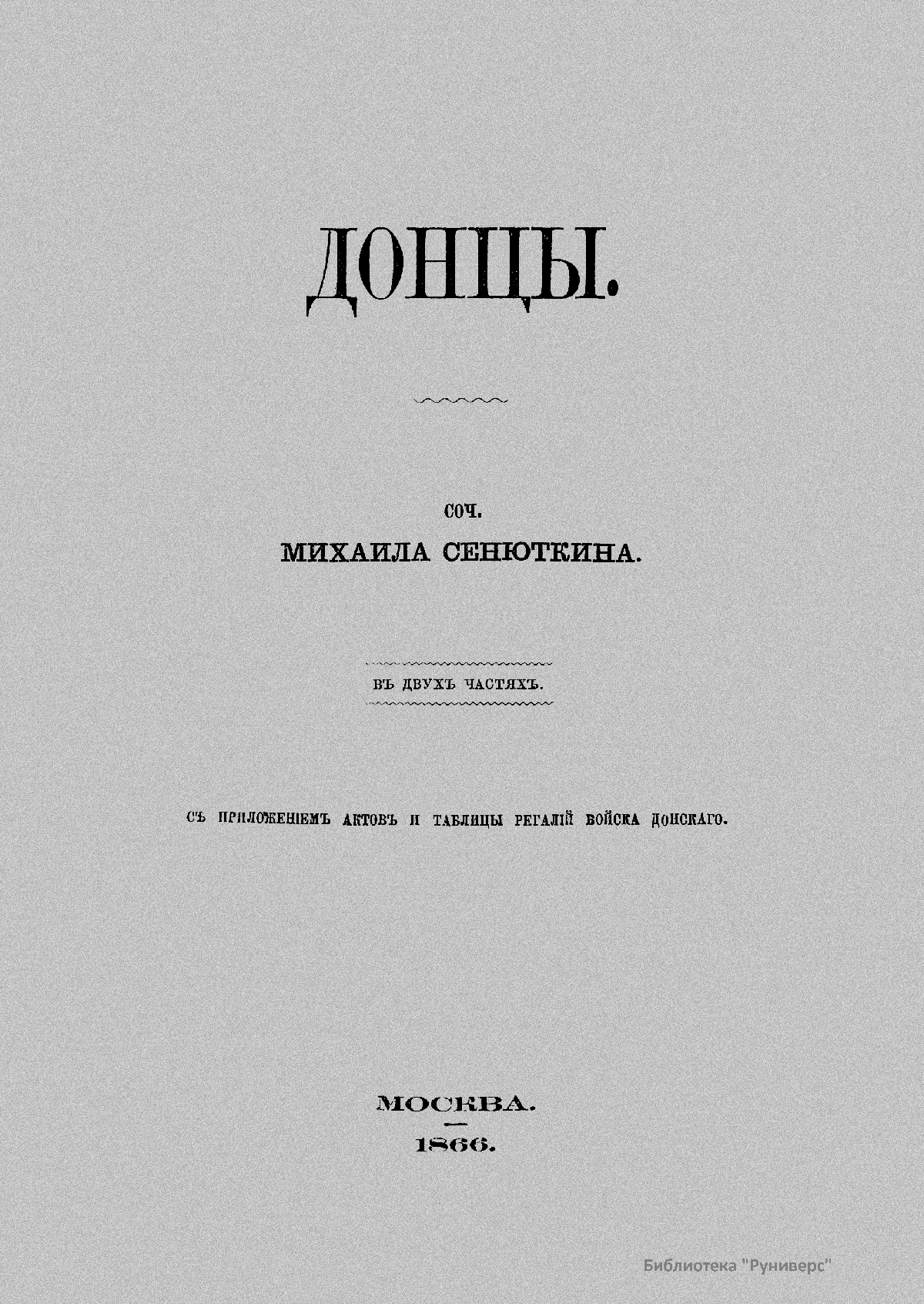 Книга включает в себя исторические очерки военных действий, заметки о быте, факты из истории войска Донского. Этот литературный труд многих лет вышел в канун 1870 г., празднования трехсотлетия войска Донского. Первая часть издания содержит два исторических очерка военных действий донцев против крымского хана Девлет-Гирея и Пугачева. Во второй части напечатаны биографии донских старшин и заметки из современного быта, в виде эпилога автор помещает свой взгляд на историю войска Донского, а в приложениях — таблицу регалий и важнейшие акты, относящиеся к эпохе. Сенюткин Михаил Христофорович (1825–1879) — журналист, редактор «Донских войсковых ведомостей». Основал неофициальный отдел в этой газете, где помещал статьи и материалы по истории Дона. Публиковался в столичных журналах «Современник» и «Военный сборник».