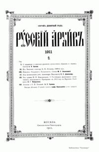 «Русский архив» — ежемесячный историко-литературный журнал, издававшийся в Москве с 1863 по 1917 год. Создателем и продолжительные годы редактором журнала был П. И. Бартенев – историк, археограф, библиограф. Этот журнал называли «живой картиной былого», поскольку он содержал преимущественно публикации неизданных мемуарных, эпистолярных, литературно-художественных и ведомственных документальных материалов, освещавших культурную и политическую историю России в XVIII и XIX вв. По числу опубликованных источников «Русский архив» стоит на первом месте среди русских исторических журналов.