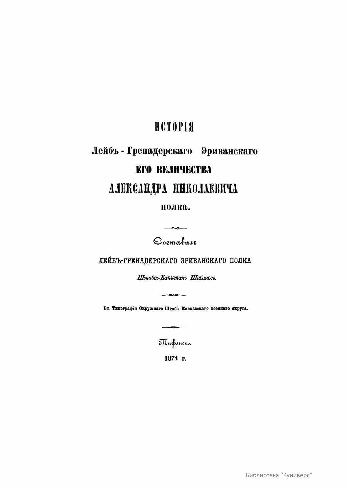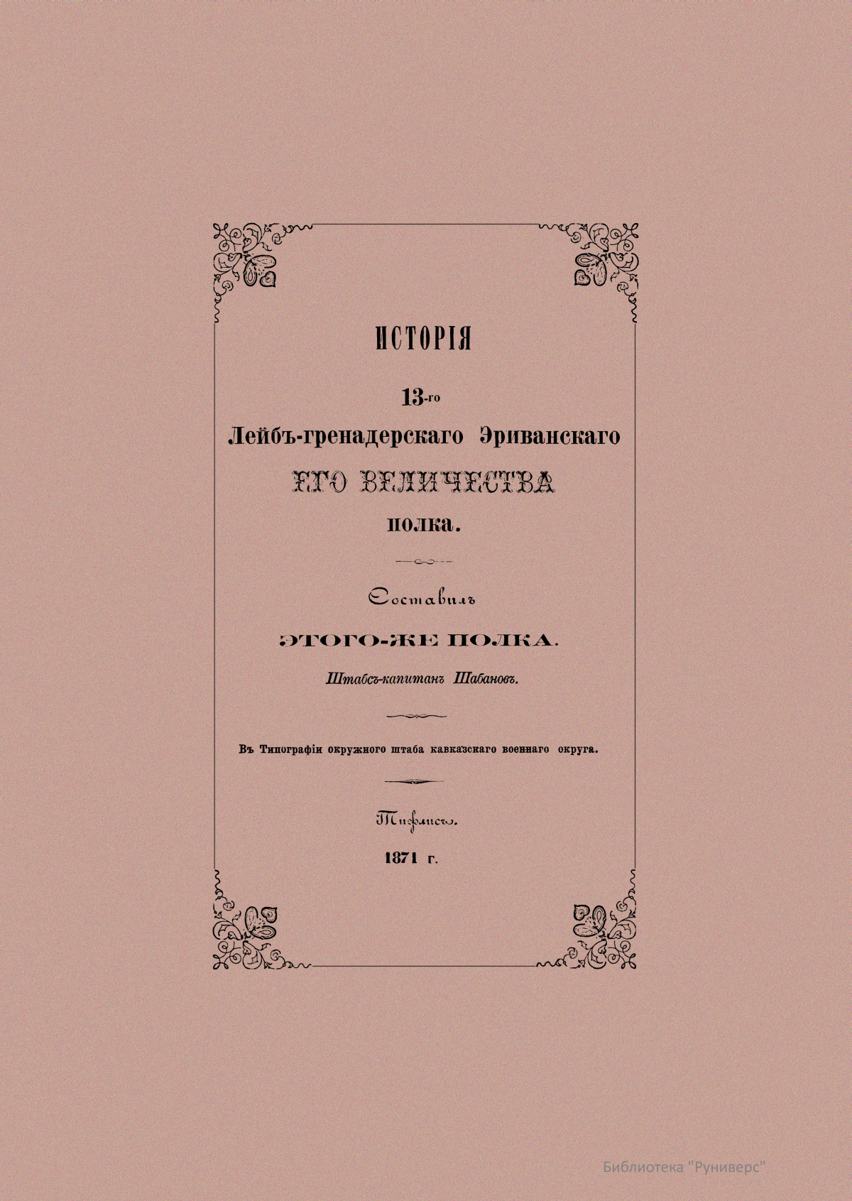 Эриванский 13-й лейб-гренадерский полк — старейший и наиболее титулованный полк русской армии. История полка началась в 1642 г., когда по указу царя Михаила Федоровича был сформирован Московский выборный солдатский Бутырский полк из числа московских стрельцов. Полк веками достигал своей боевой славы на полях битвы за родное отечество. Первым летописцем истории полка стал штабс-капитан этого полка Дмитрий Федорович Шабанов. Для подготовки данного издания автор использовал материалы архивов главного кавказского штаба, канцелярии кавказского наместника, а также полкового архива, хранившего текущую переписку с 1811 г. Боевые действия и события внутренней жизни полка изложены в хронологическом порядке. В повествовании название полка сохранено то, под каким он действовал в течение описываемой эпохи.