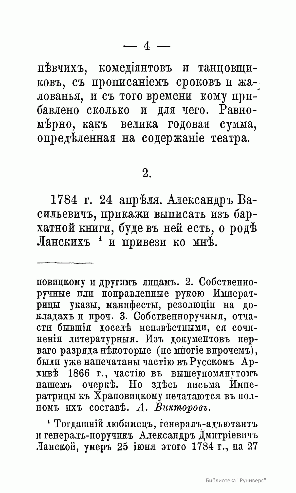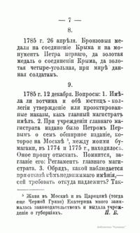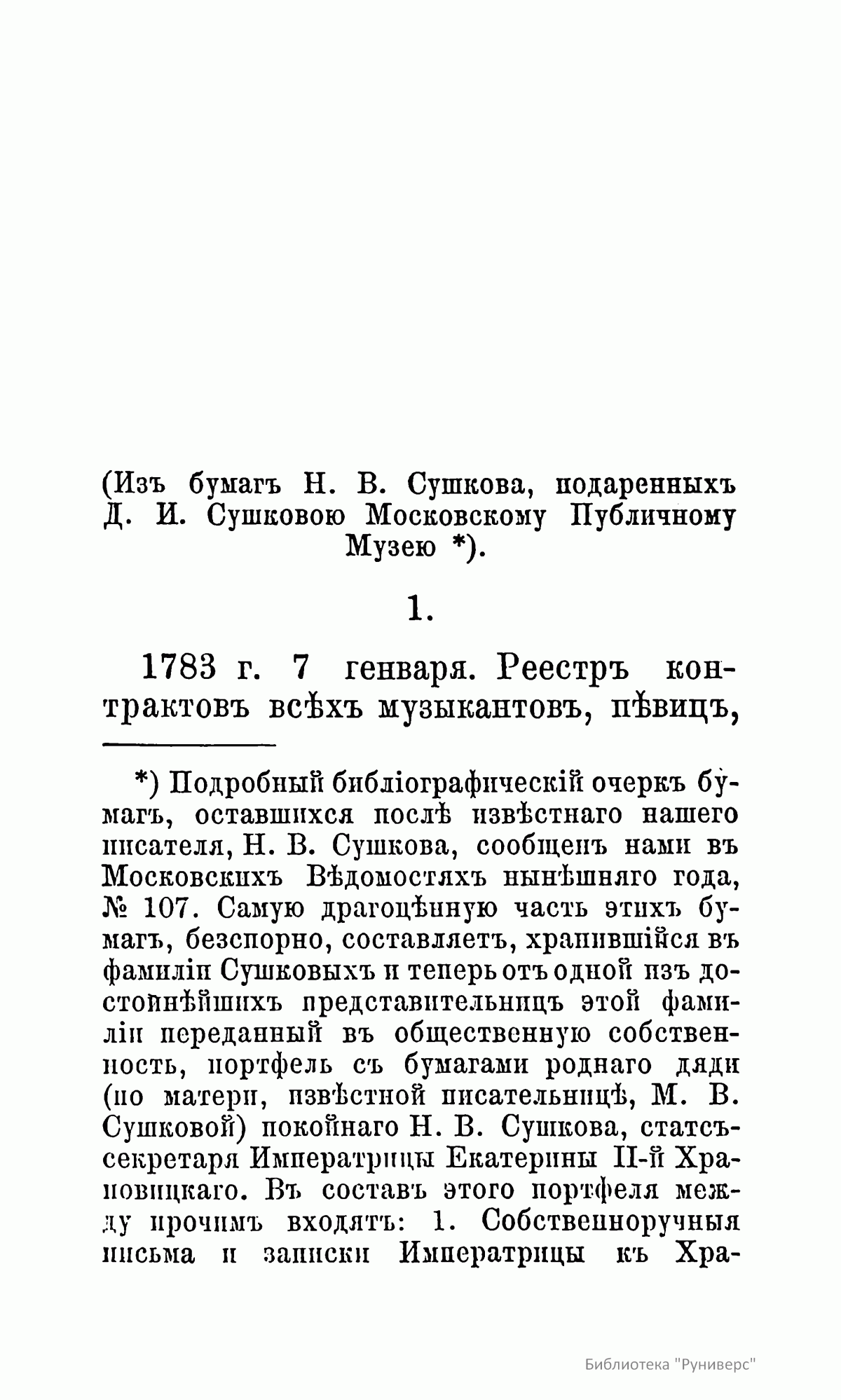 Статс-секретарь императрицы Екатерины Второй А. В. Храповицкий был родным дядей литератора, поэта и драматурга, хозяина известного в XIX веке литературного салона – Николая Васильевича Сушкова (1796 – 1871). В доме Н. В. Сушкова хранился портфель с бумагами Храповицкого, которые после смерти Н. В. Сушкова были переданы Московскому публичному музею (открыт 23 мая (по старому стилю) 1861 г. в Доме Пашкова в Москве). Среди этих бумаг находились и собственноручные письма и записки императрицы Екатерины Второй к Храповицкому и другим лицам. В настоящем издании полностью опубликованы записки к Храповицкому. Они представляют собой многочисленные распоряжения императрицы. Круг забот Екатерины чрезвычайно широк – от государственных до мелких бытовых проблем. – «1788 г. августа 11. Скажите Степану Федоровичу, чтобы онъ не услалъ в армiю шпагу, как золотую, такъ и съ брилiянтами, такожде и блюдо золотое для кн. Потемкина, не показавъ мне самой. Также наведайтесь, когда кiевское паникадило поспеетъ».