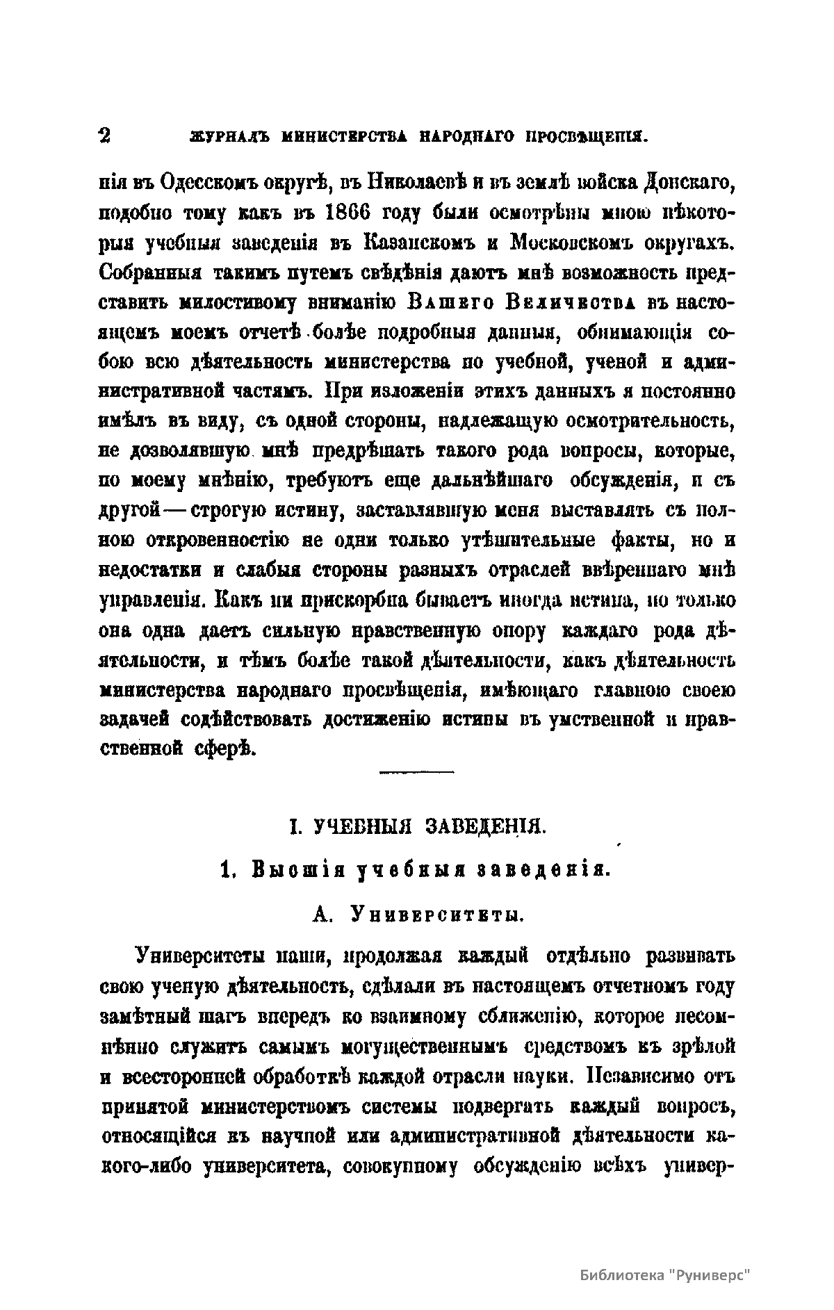 Журнал Министерства народного просвещения выходил с 1834-го по 1917 год. Официальный периодический журнал об успехах просвещения в России. Издатели журнала уверены в том, что «если для каждого человека необходим выход из грубой тьмы невежества и беспрерывное дальнейшее движение к свету, то для народов необходимо попечительное участие правительства в образовании. Только правительство имеет все средства знать и высоту успехов всемирного образования, и настоящие нужды Отечества».