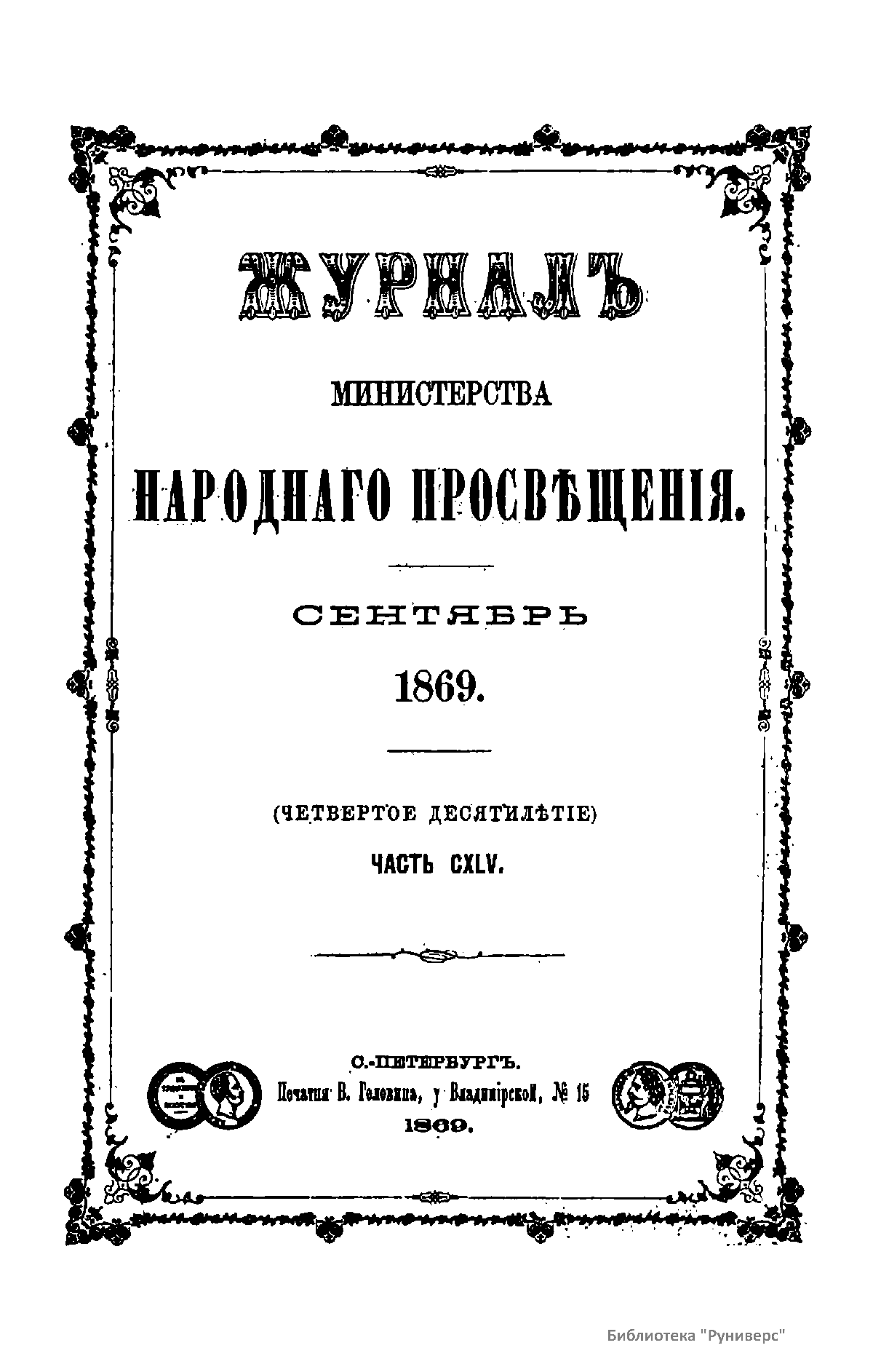 Журнал Министерства народного просвещения выходил с 1834-го по 1917 год. Официальный периодический журнал об успехах просвещения в России. Издатели журнала уверены в том, что «если для каждого человека необходим выход из грубой тьмы невежества и беспрерывное дальнейшее движение к свету, то для народов необходимо попечительное участие правительства в образовании. Только правительство имеет все средства знать и высоту успехов всемирного образования, и настоящие нужды Отечества».