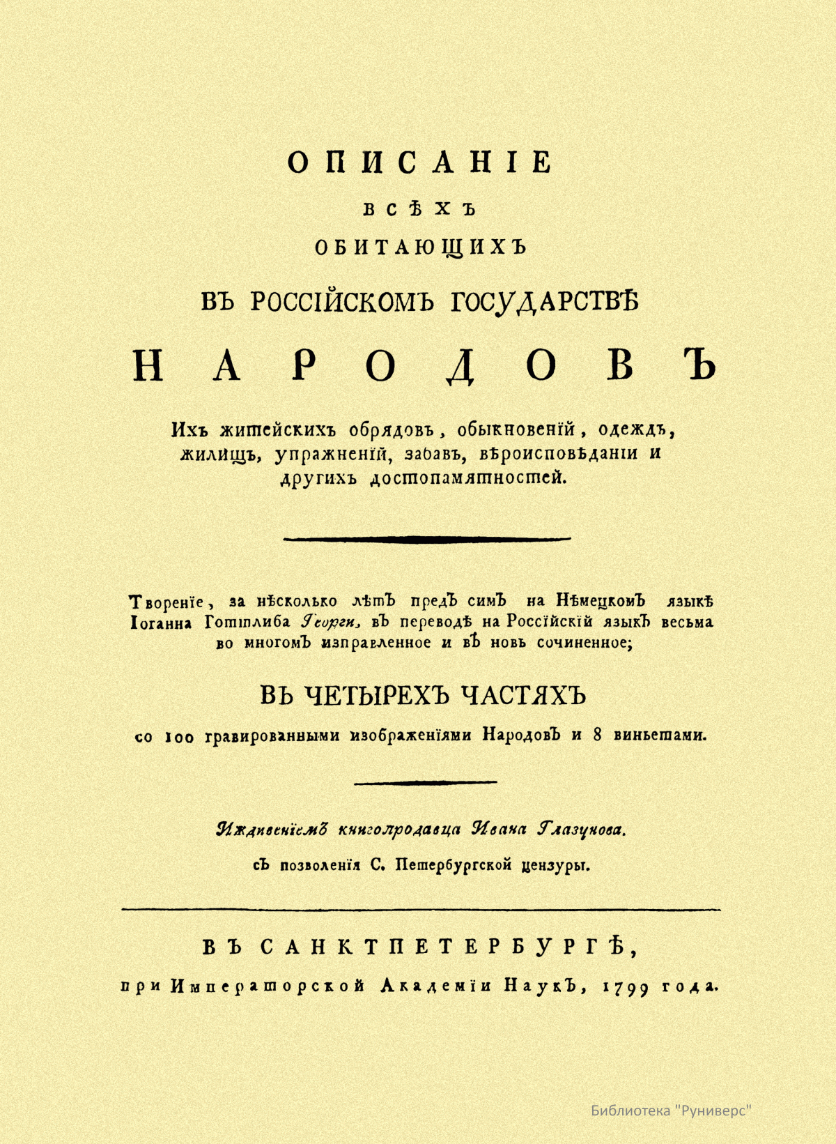 Иоганн Готлиб Георги (1729–1802) — урожденный немец, медик, этнограф, натуралист, химик, путешественник, профессор минералогии и академик Российской Императорской академии наук. Участвовал в экспедициях Палласа и Фалька, много лет занимался исследованием Поволжья, Среднего и Южного Приуралья, Сибири и Алтайских гор, Байкала и Прибайкалья. Итогом многолетних этнографических исследований Георги стало подробное иллюстрированное описание народностей, населяющих Россию. Этот труд вышел в Санкт-Петербурге в 1776–1780-х годах под названием “Beschreibung aller Nationen des Russischen Reichs, ihrer Lebensart, Religion, Gebräuche, Wohnungen, Kleidung und übrigen Merkwürdigkeiten” («Описание всех народов Российского государства, их быта, вероисповедания, обычаев, жилищ, одежды и остальных отличий») и был частично переведен на русский язык. Он вобрал в себя обширный и подробный материал по истории и этнографии, полученный как самим автором, так и многими другими исследователями и путешественниками. Впервые в одной книге были собраны и систематизированы сведения о различных сторонах культуры и быта народов России. В 1799 году работа была полностью переведена на русский язык, претерпев, таким образом, второе издание. Особенную ценность, помимо подробных этнографических описаний, безусловно, представляют красочные иллюстрации, дающие полное представление об облике, образе жизни, промыслах и национальном костюме всех народов и племен, населяющих территорию России. Работа по праву признана мировым эталоном этнографического исследования.