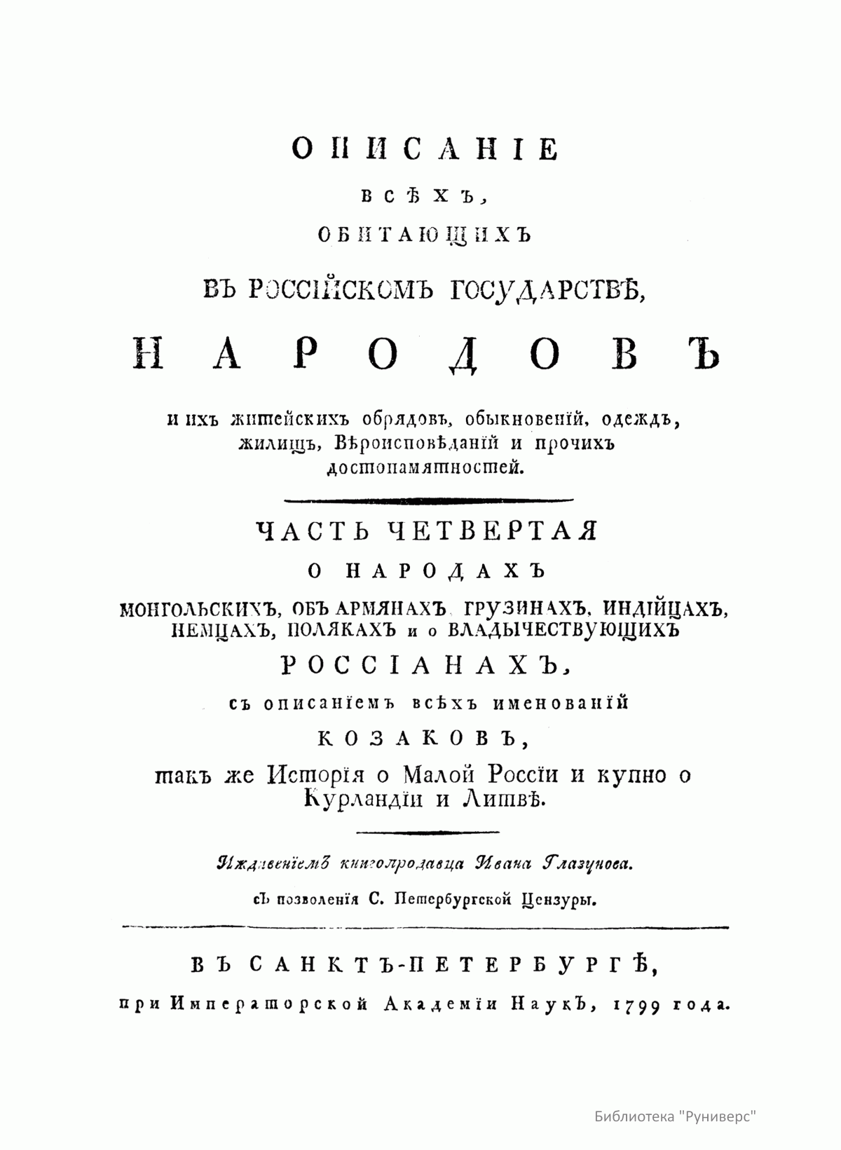 Описанiе всѣхъ обитающихъ въ Россiйскомъ государствѣ народовъ. Ихъ житейскихъ обрядовъ, обыкновенiй, одеждъ, жилищъ, упражненiй, забавъ, вѣроисповѣданiй и другихъ достопамятностей. Часть четвертая о народахъ монгольскихъ, объ армянахъ, грузинахъ, индiйцахъ, немцахъ, полякахъ и о владычествующихъ россiанахъ, съ описанiемъ всѣхъ именованiй козаковъ, такъ же Исторiя о Малой Россiи и купно о Курландiи и Литвѣ