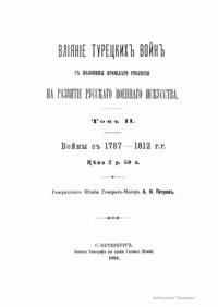Книга «Влияние турецких войн с половины прошлого столетия на развитие русского военного искусства» представляет собой двухтомное издание, в котором автор рассматривает причины конфликтов между Россией и Турцией. Проводит подробный анализ и дает оценку военной подготовки, оснащенности обеих армий. Подробно описывает кампании 1769–1774 и 1787–1812 гг., а так же проводит тактический разбор главнейших генеральных сражений. В завершении, автор делает выводы о влиянии войн с Турцией на развитие русского военного искусства. Рассуждает о необходимости выбора стратегии и тактики для успешного ведения сражений. О необходимости накопления военного опыта не только на полях сражений, но и в ходе тщательного, глубокого, систематического изучения и применения военных знаний и умений полководцев и главнокомандующих известных военной истории. К изданию прилагается множество карт, схем и планов сражений.
