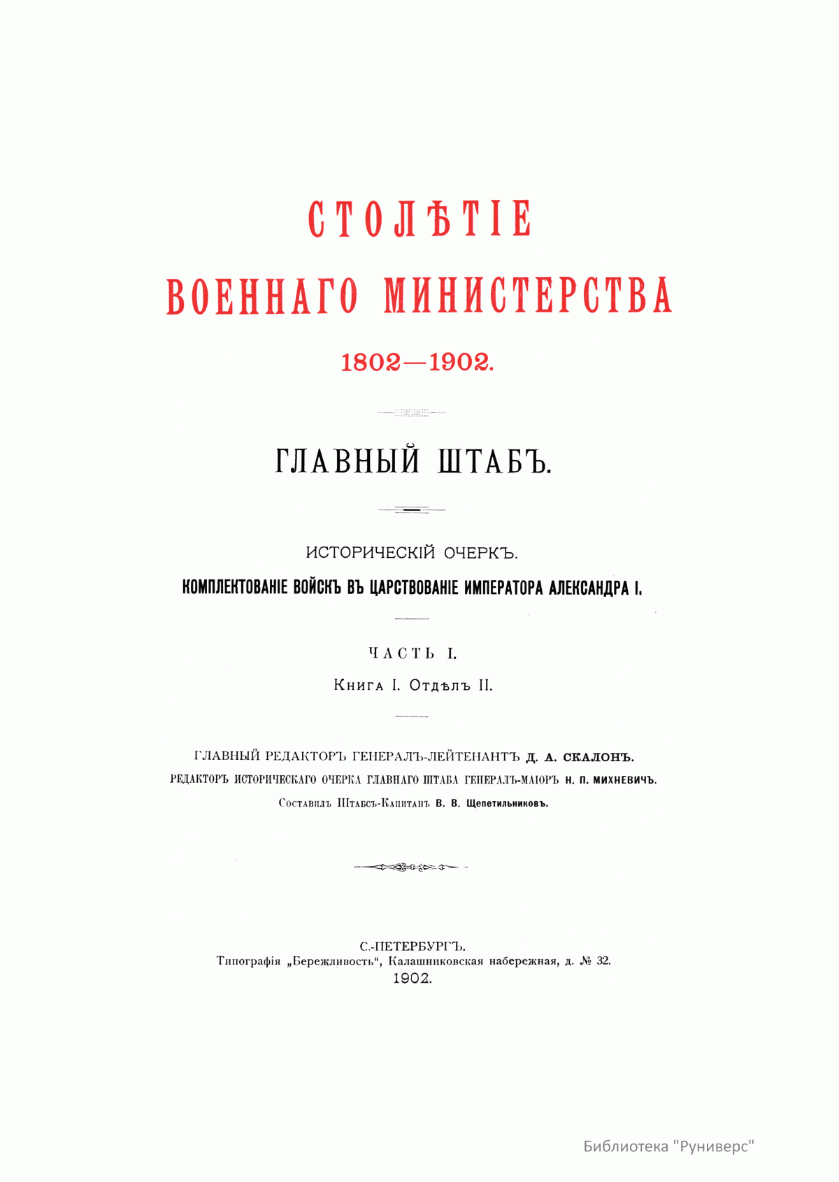 Столетие военного министерства. 1802-1902. Главный штаб. Исторический очерк. Комплектование войск в царствование Императора Александра I