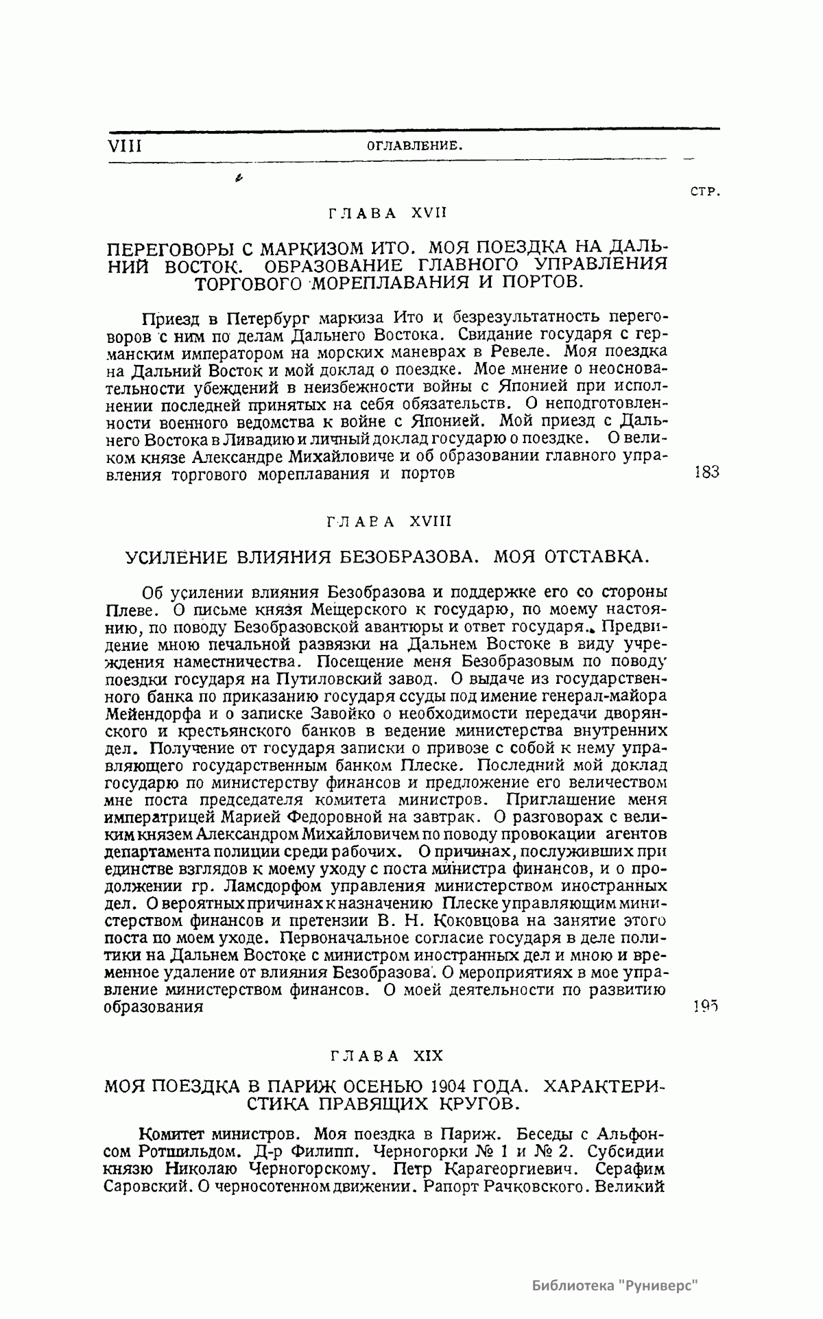 Воспоминания графа, русского государственного деятеля Сергея Юльевича Витте (1849 – 1915) опубликованы в трех томах. Первый том охватывает события от смерти Александра III до 17 октября 1905 года. Второй том – от манифеста 17 октября 1905 года до убийства Столыпина в 1911 г. В третьем томе изложение доведено до смерти Александра III и включает воспоминания о детстве автора. Все три тома снабжены подробным оглавлением.