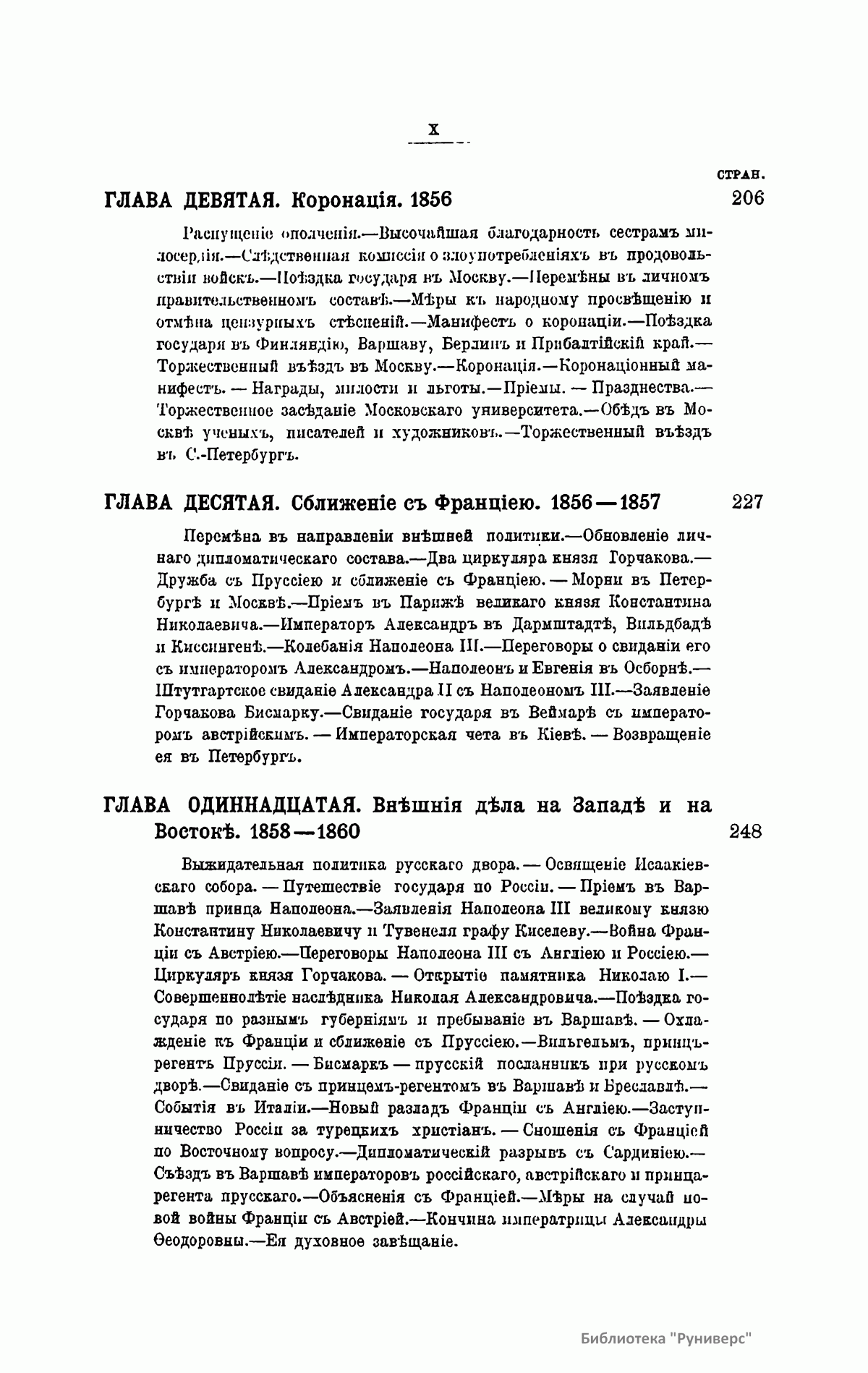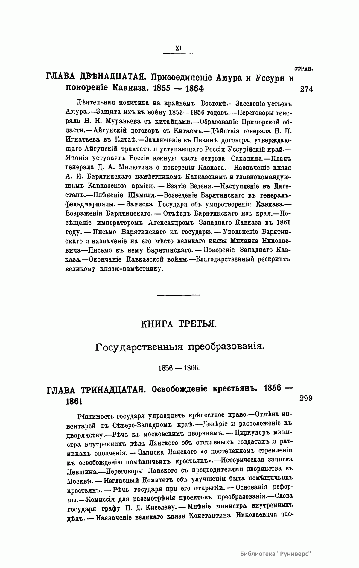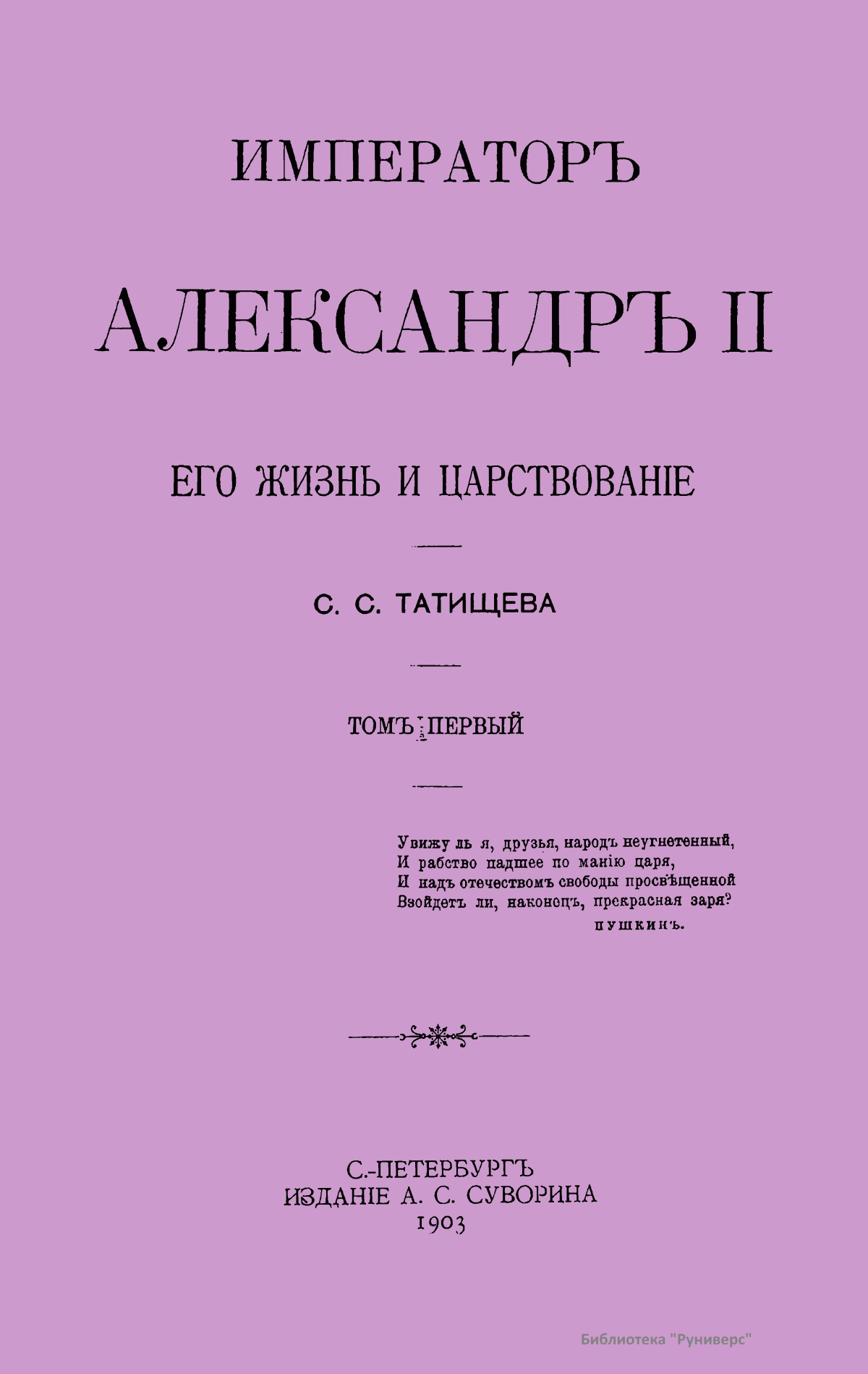 Александр II (1818 – 1881) – российский император с 1855 г. Старший сын Николая I. В 1861 г. в значительной степени благодаря его последовательности был устранен корень всех зол, терзавших Россию, – многовековое крепостное право, затем подготовлен и проведен целый комплекс реформ: судебная, земская и многие другие, открывавшие путь к созданию нового, более прогрессивного государственного устройства. В царствование Александра II завершилось присоединение к России Кавказа (1864), Казахстана (1865), большей части Средней Азии (1865 –1881). На жизнь Александра II был совершен ряд покушений (1866, 1867, 1879, 1880), убит народовольцами. Автор настоящего фундаментального труда Татищев Сергей Спиридонович видит свою задачу в том, «чтобы собрать воедино многочисленные свидетельства об отдельных моментах и эпизодах жизни и деятельности государя Александра Николаевича и, дополнив их собственными изысканиями, составить точный и по возможности полный прагматический свод событий его царствования и личного в них участия или воздействия на них императора в области политики как внутренней, так и внешней». В основание своей работы автор положил материалы, изученные им в Государственном и Главном Санкт-Петербургском архиве министерства иностранных дел, в архивах Государственного совета, бывшего III отделения Собственной Его Величества канцелярии, в Военно-ученом архиве Главного штаба. Кроме того, автор имел доступ в некоторые архивы иностранных государств и частные архивы.
