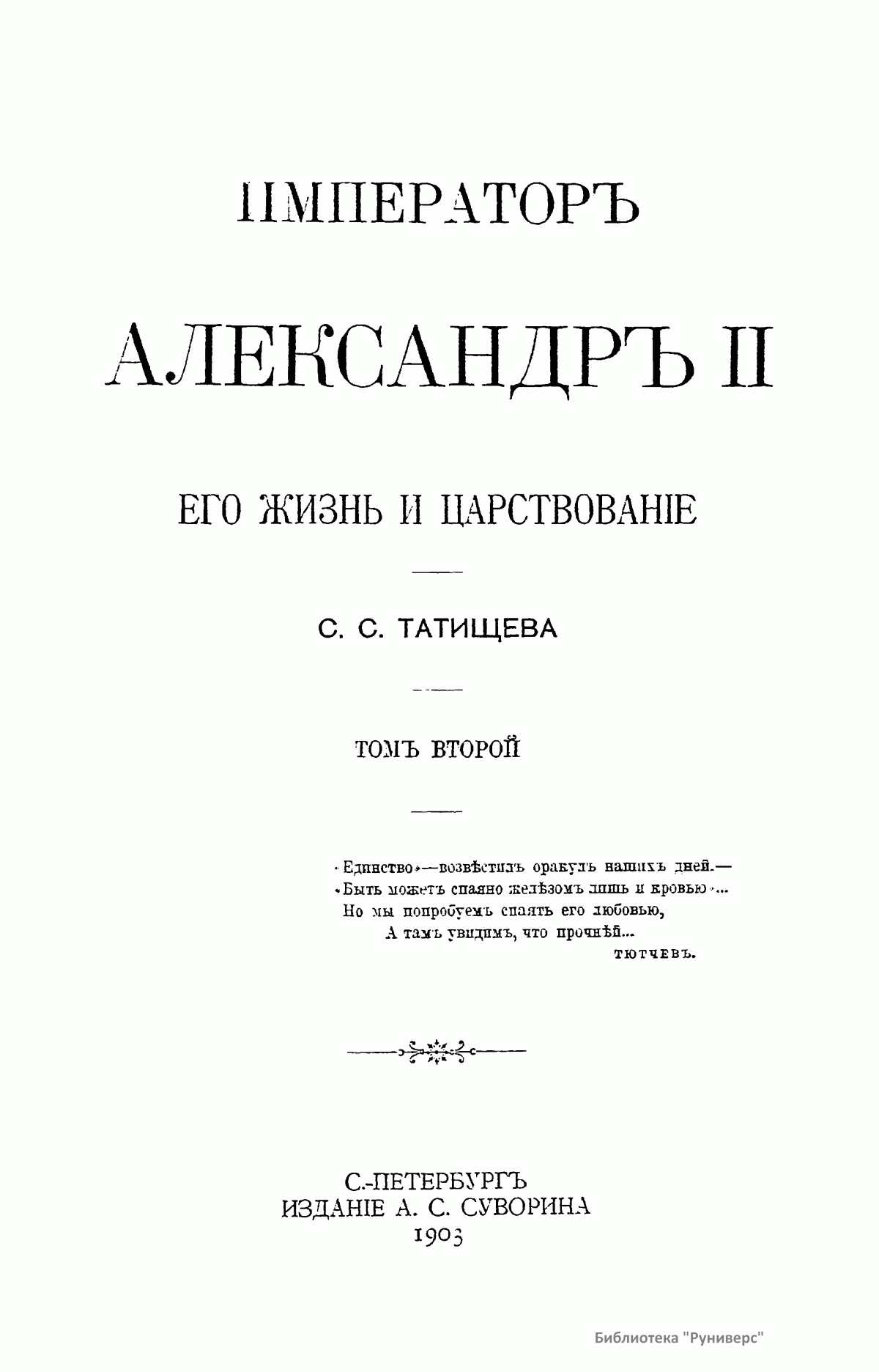 Александр II (1818 – 1881) – российский император с 1855 г. Старший сын Николая I. В 1861 г. в значительной степени благодаря его последовательности был устранен корень всех зол, терзавших Россию, – многовековое крепостное право, затем подготовлен и проведен целый комплекс реформ: судебная, земская и многие другие, открывавшие путь к созданию нового, более прогрессивного государственного устройства. В царствование Александра II завершилось присоединение к России Кавказа (1864), Казахстана (1865), большей части Средней Азии (1865 –1881). На жизнь Александра II был совершен ряд покушений (1866, 1867, 1879, 1880), убит народовольцами. Автор настоящего фундаментального труда Татищев Сергей Спиридонович видит свою задачу в том, «чтобы собрать воедино многочисленные свидетельства об отдельных моментах и эпизодах жизни и деятельности государя Александра Николаевича и, дополнив их собственными изысканиями, составить точный и по возможности полный прагматический свод событий его царствования и личного в них участия или воздействия на них императора в области политики как внутренней, так и внешней». В основание своей работы автор положил материалы, изученные им в Государственном и Главном Санкт-Петербургском архиве министерства иностранных дел, в архивах Государственного совета, бывшего III отделения Собственной Его Величества канцелярии, в Военно-ученом архиве Главного штаба. Кроме того, автор имел доступ в некоторые архивы иностранных государств и частные архивы.