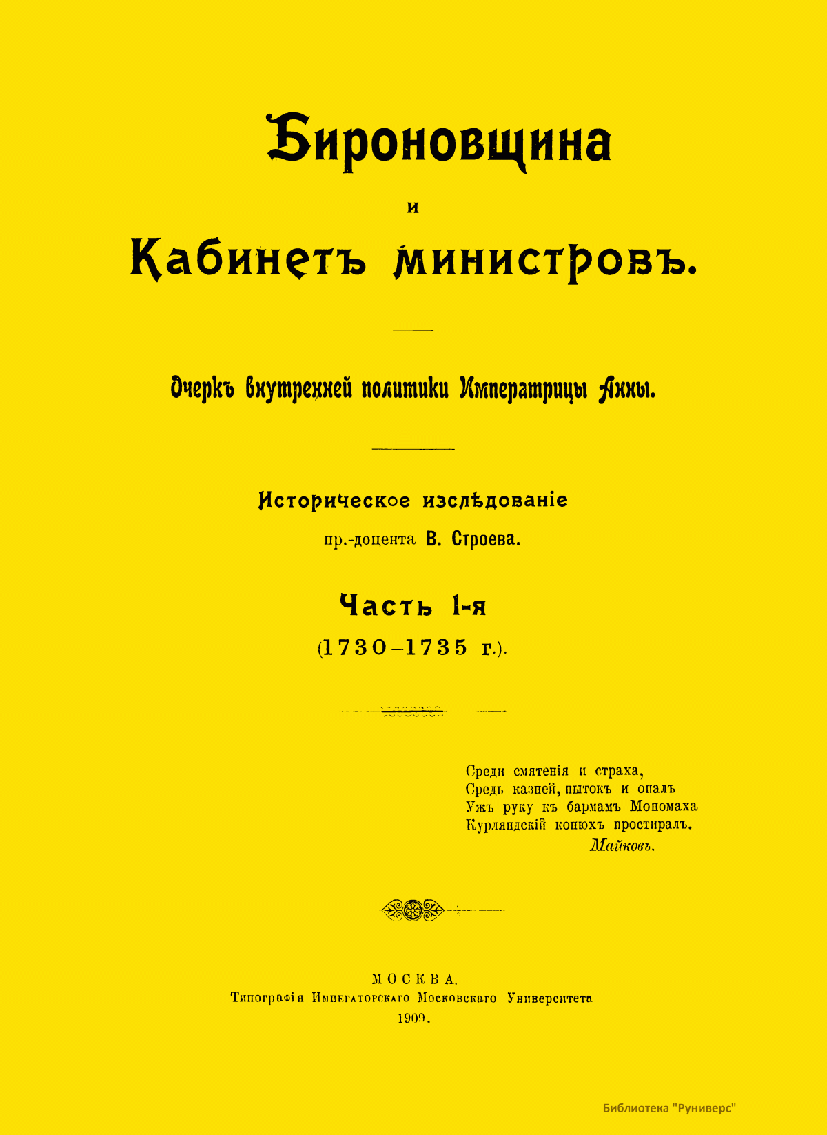 Эрнест-Иоанн Бирон (1690 – 1772), граф, фаворит императрицы Анны Иоанновны, герцог Курляндский (с 1737). Играл роль верховного владыки во все царствование императрицы (1730 – 1740). После ее смерти был несколько недель регентом за малолетством только что родившегося Иоанна Антоновича, объявленного императором Российской империи. После дворцового переворота в 1740 г. арестован и сослан. Помилован и возвращен в Петербург императором Петром III. Время правления Бирона заклеймено в истории именем «Бироновщина». Почти все современники Бирона и большинство позднейших историков считали время Анны Иоанновны вследствие господства Бирона самым бедственным временем для русского государства: засилье иностранцев, разграбление богатств страны, всеобщая подозрительность, шпионаж, доносы, жестокое преследование недовольных. Тем не менее, по словам автора настоящего издания В. Строева, «влияние Бирона нельзя назвать безусловно вредным». Автор в качестве эпиграфа использует слова А.С. Пушкина из письма к Лажечникову: «Он (Бирон) имел несчастие быть немцем. На него свалили весь ужас царствования Анны, которое было в духе его времени и в нравах народа». Историческое исследование В. Строева посвящено подробному анализу внутренней политики Анны Иоанновны. Автор доказывает, что кабинет министров до 1735 г. резко отличается от этого учреждения после 1735 г. Первая часть издания освещает события с 1730-го по 1735 г. Вторая часть посвящена кабинету министров после 1735 г.