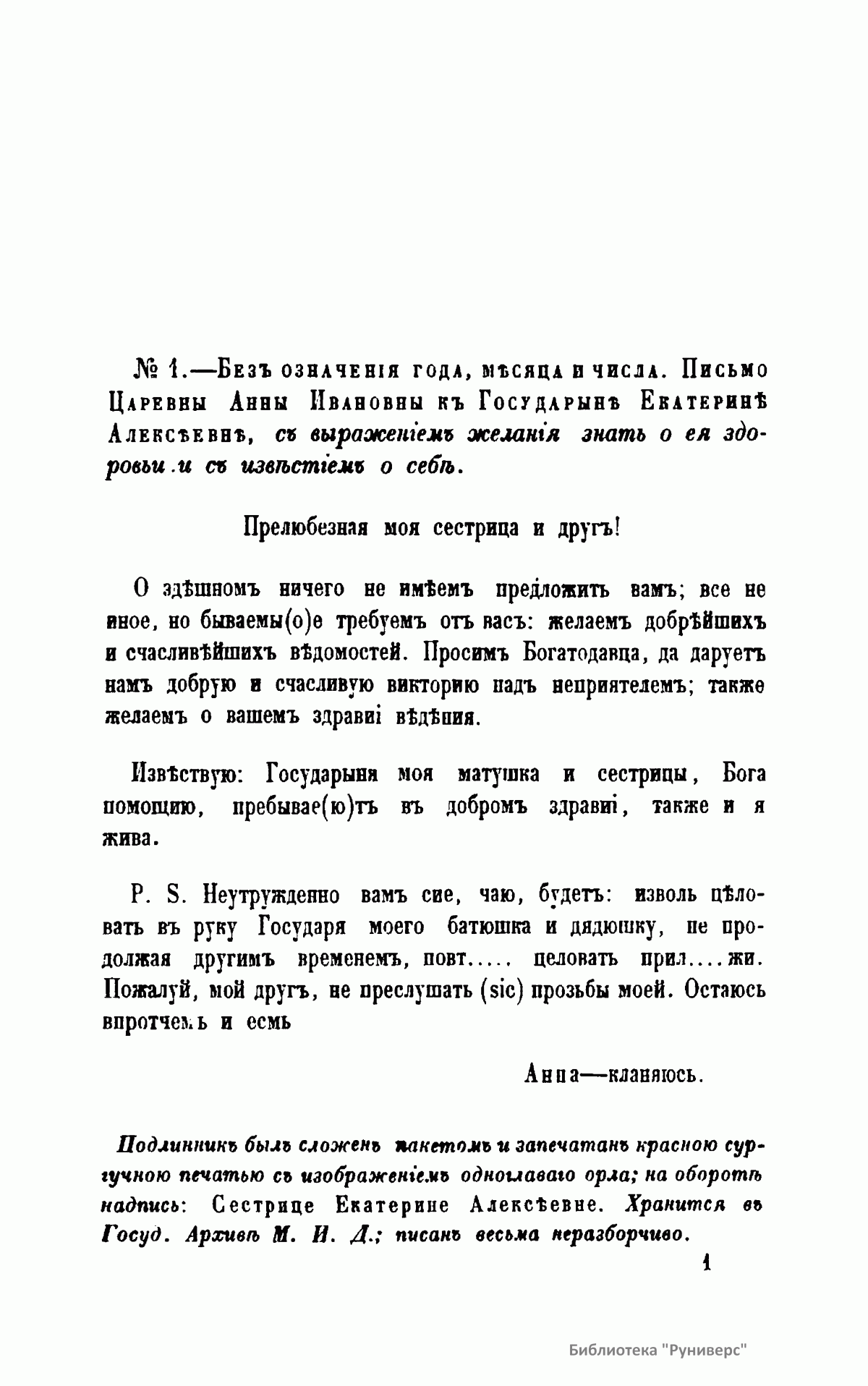Письма русских государей и других особ царского семейства. IV. Переписка Герцогини Курляндской Анны Ивановны