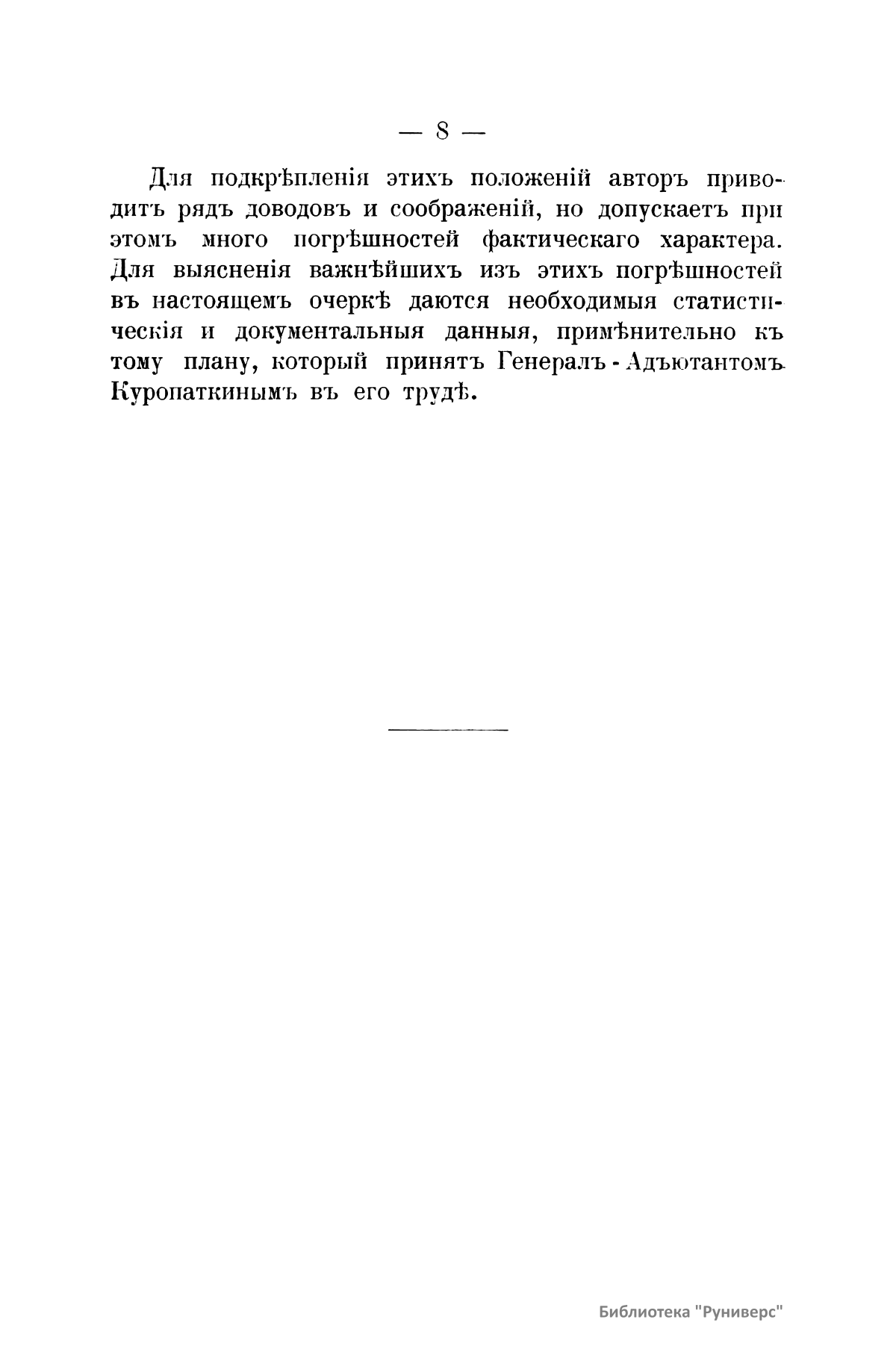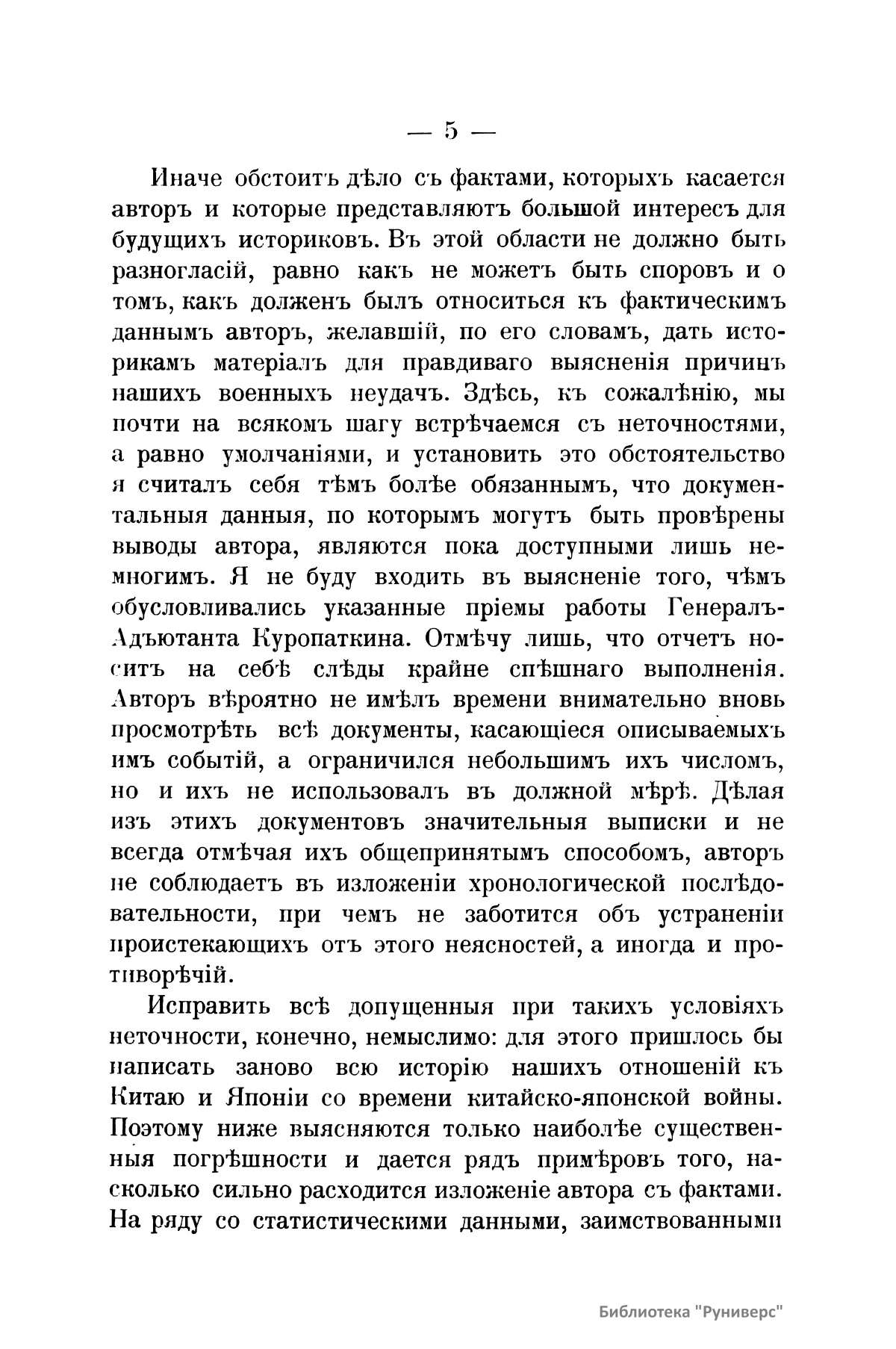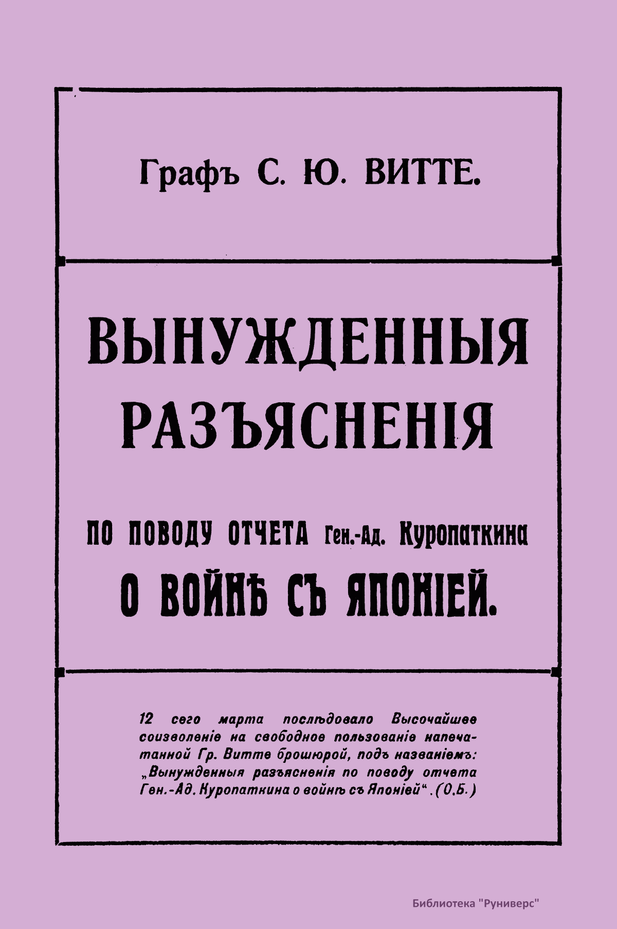 В книге русский государственный деятель Витте С.Ю. полемизирует с генерал-адъютантом Куропаткиным по поводу отчета последнего о русско-японской войне 1904 – 1905 гг. Военный министр и главнокомандующий всеми вооруженными силами, действовавшими против Японии, генерал-адъютант Куропаткин в 1906 г. издал отчет о войне в четырех томах. Первые три тома посвящены сражениям: под Ляояном, на р. Шахе, под Мукденом. В четвертом томе подведены итоги войны. Именно четвертый том Витте выбрал объектом своего исследования, так как, по его мнению, именно в нем содержатся неправильные выводы и предположения. Витте считает их односторонними и даже пристрастными. Автор не стремится исправить все допущенные ошибки, а выясняет наиболее существенные погрешности и дает ряд примеров того, насколько сильно расходится изложения автора с фактами. Русско-японская война 1904 – 1905 гг. – война за контроль в Северо-Восточном Китае и Корее. Начата Японией. Основные события 1904 г.: нападение японского флота на Порт-Артур, оборона Порт-Артура, неудачные для России сражения на р. Ялу, Ляоянское, на р. Шахе. Основные события 1905 г.: поражение русской армии при Мукдене, флота – при Цусиме. Война завершилась Портсмутским мирным договором, зафиксировавшим уступку Россией Японии южной части Сахалина и своих арендных прав на Ляодунский полуостров и Южно-Маньчжурскую железную дорогу.