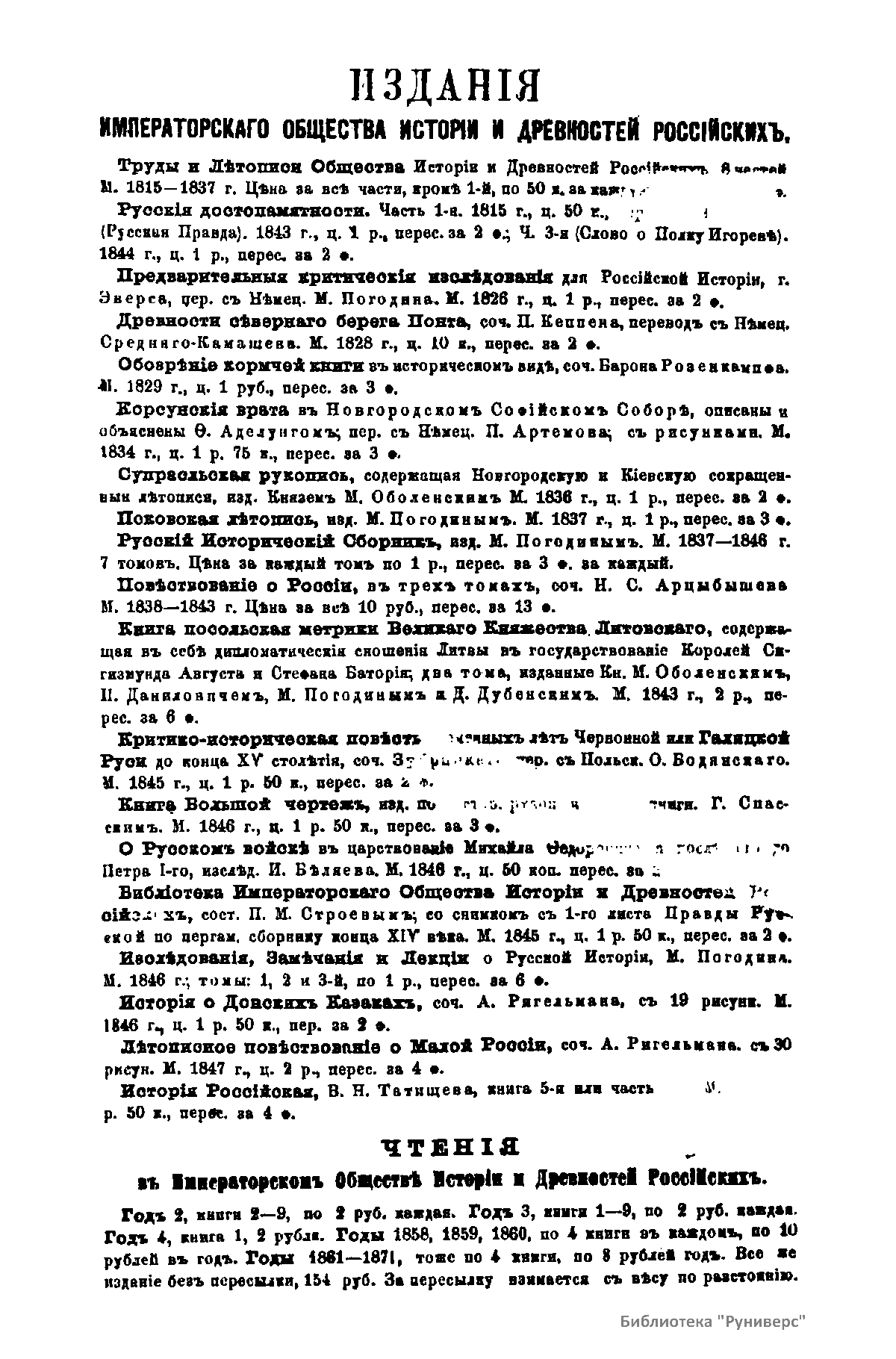 «Чтения в Императорском обществе истории и древностей российских» – периодическое издание трудов Общества. Выпускались отдельными книгами на протяжении 72 лет с десятилетним перерывом. Первая книга вышла в свет в январе 1846 г. Каждая книга состояла из четырех разделов: исторических исследований, отечественных исторических документальных материалов, иностранных материалов и смеси. Публиковались также исследования и материалы по археологии, этнографии, нумизматике, палеографии и другим дисциплинам. До июня 1848 г. было выпущено 23 книги «Чтений». В июньской книге за 1848 г. О. М. Бодянский поместил записки Дж. Флетчера о Московском государстве, что вызвало недовольство Николая I. «Чтения» были закрыты, а Бодянский удален из Московского университета. Издание «Чтений» возобновилось только в 1858 г., когда Бодянский снова стал секретарем общества. Издание приняло славянофильское направление, к прежним четырем разделам «Чтений» прибавился раздел славянских материалов. С 1858 г. «Чтения» выходили в свет четыре раза в год.